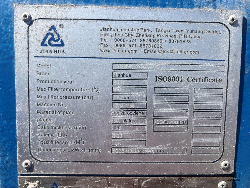 Filter area 60m2, volume 923 litres, cake thickness 30mm.