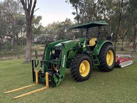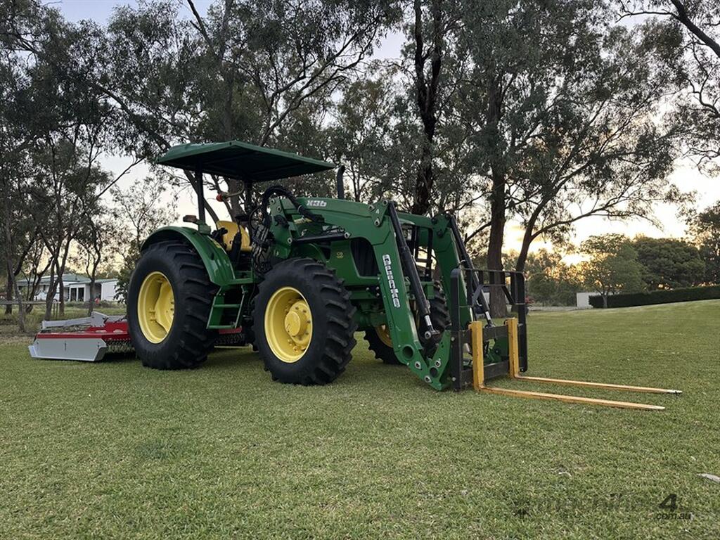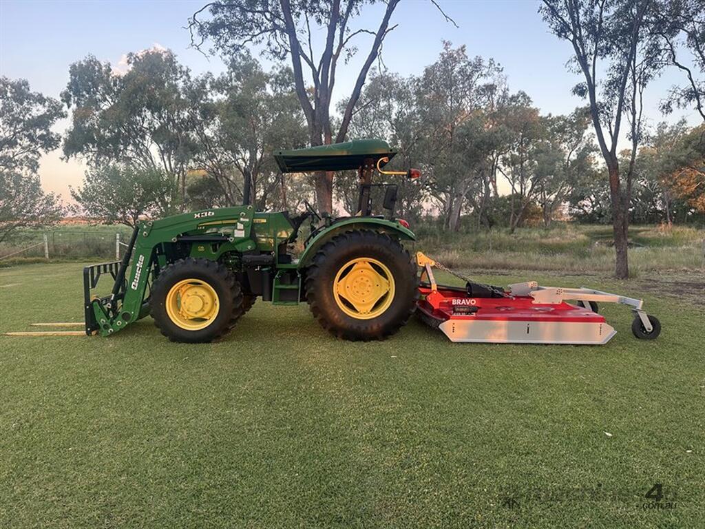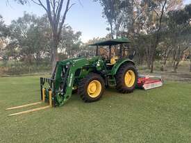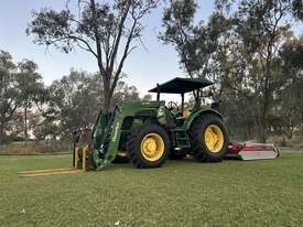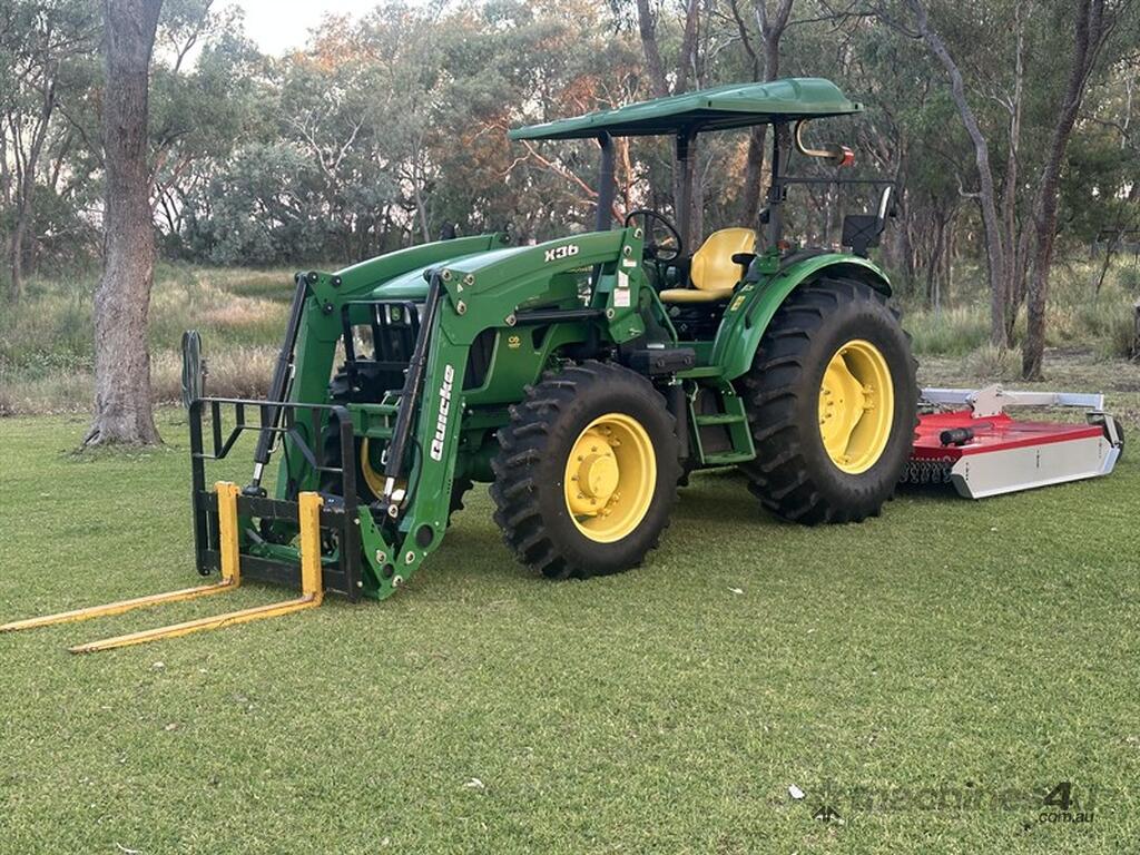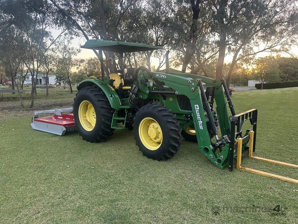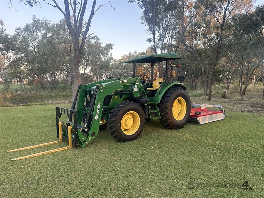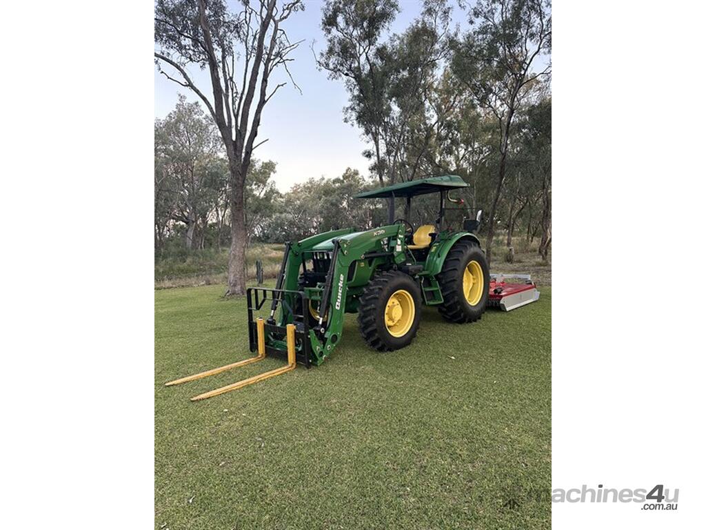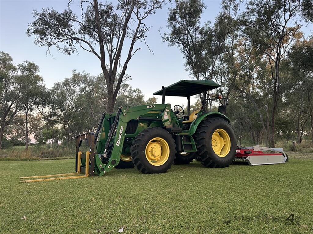 John Deere 5083E Tractor Quicke X36 Front End Loader. 83hp, 166 engine hours, FEL with forks, 4 in 1 bucket and hay spears. Sold with Auscut Bravo linking PTO slasher. Sold as a unit. Selling due to moving. Located at Moree NSW, available at MRE Auctions online sale.