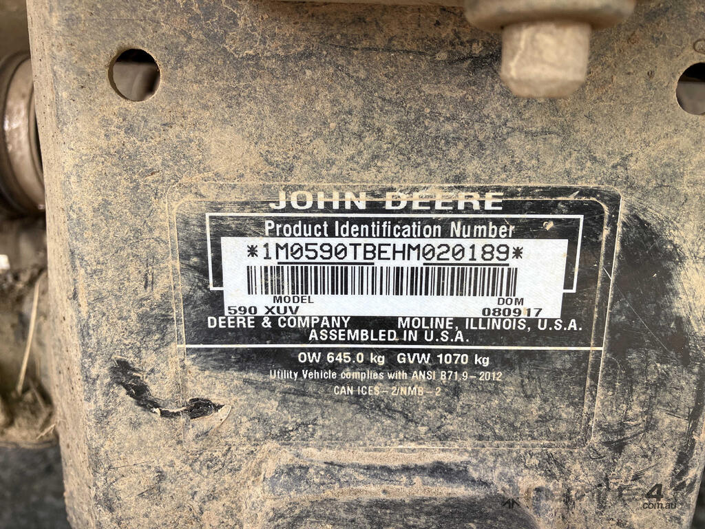 No C/P,John Deere,590,ATV,2 Cyl,Petrol,9728 (Kms. Showing on Odometer),Hourmeter not visible,Colour: Green,Unregistered,VIN: 1M0590TBEHM020189,Serial No: NULL,Sold with No Plates,WOVR Status: WOVR N/A,Incident Type: Impact