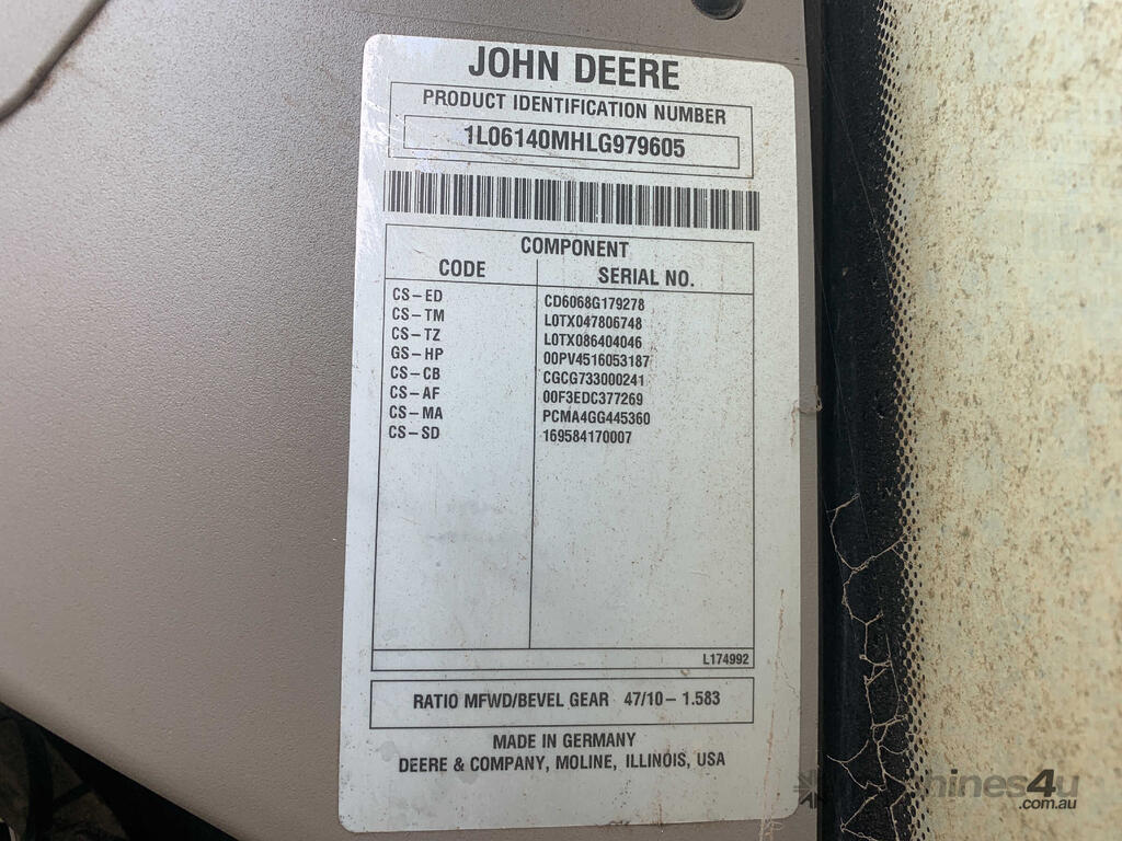 No C/P,John Deere,6140M,Tractor,4 Cyl,Diesel,Odometer not visible,Hourmeter not visible,Colour: Green,Unregistered,VIN: 1L06140MHLG979605,Chassis: 1L06140MHLG979605,Sold with No Plates,WOVR Status: WOVR N/A,Incident Type: Impact