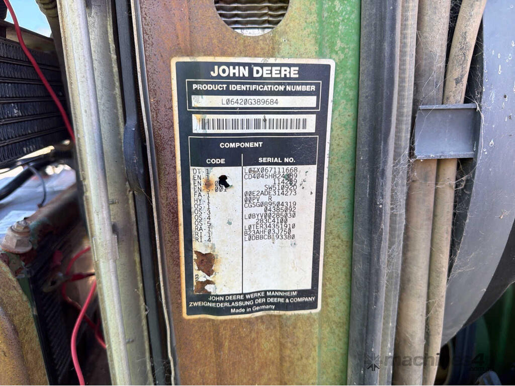 No C/P,John Deere,6420,Tractor,4 Cyl,Diesel,Odometer not visible,9424 (Hrs. Showing on Hour meter),Colour: Green,Unregistered,Serial No: L06420G389684,Sold with No Plates