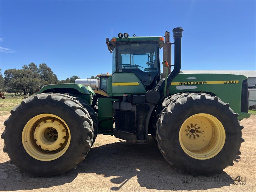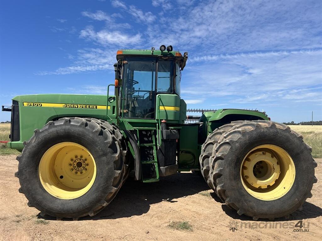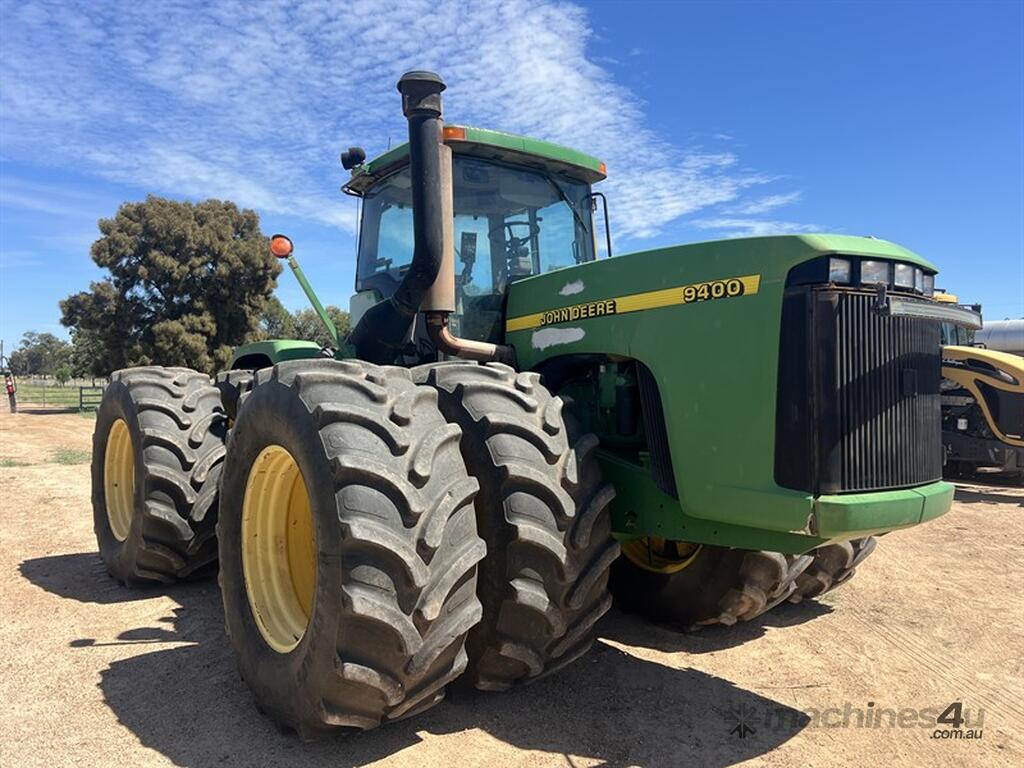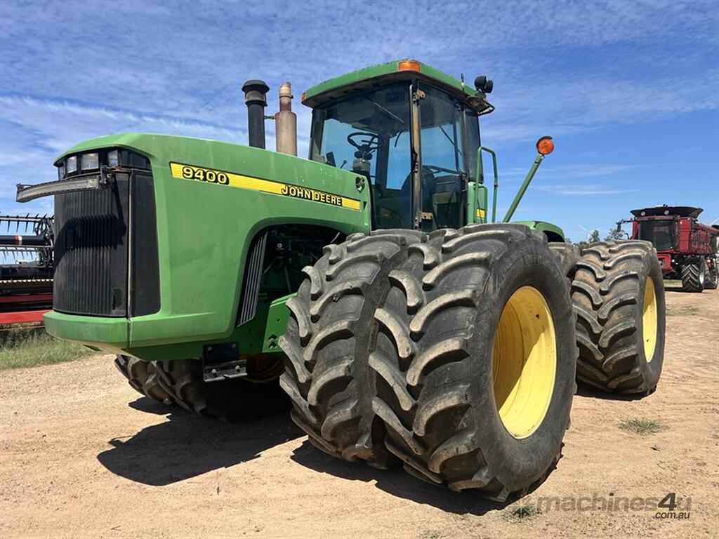 JOHN DEERE 9400 4WD Tractor. 8461hrs, Quad Box Transmission, 710/70R38 front & rear duals. 70%-80% rear wheel weight, Cabin food, UHF, radio, 4 remotes, rear weights x20, Light bar, bonnet good. Vin No RW9400H011018. Available at MRE Auctions "Pye Reduction Sale" Clearing Sale. Contact Grady Sinclair on . Located Miles, QLD.