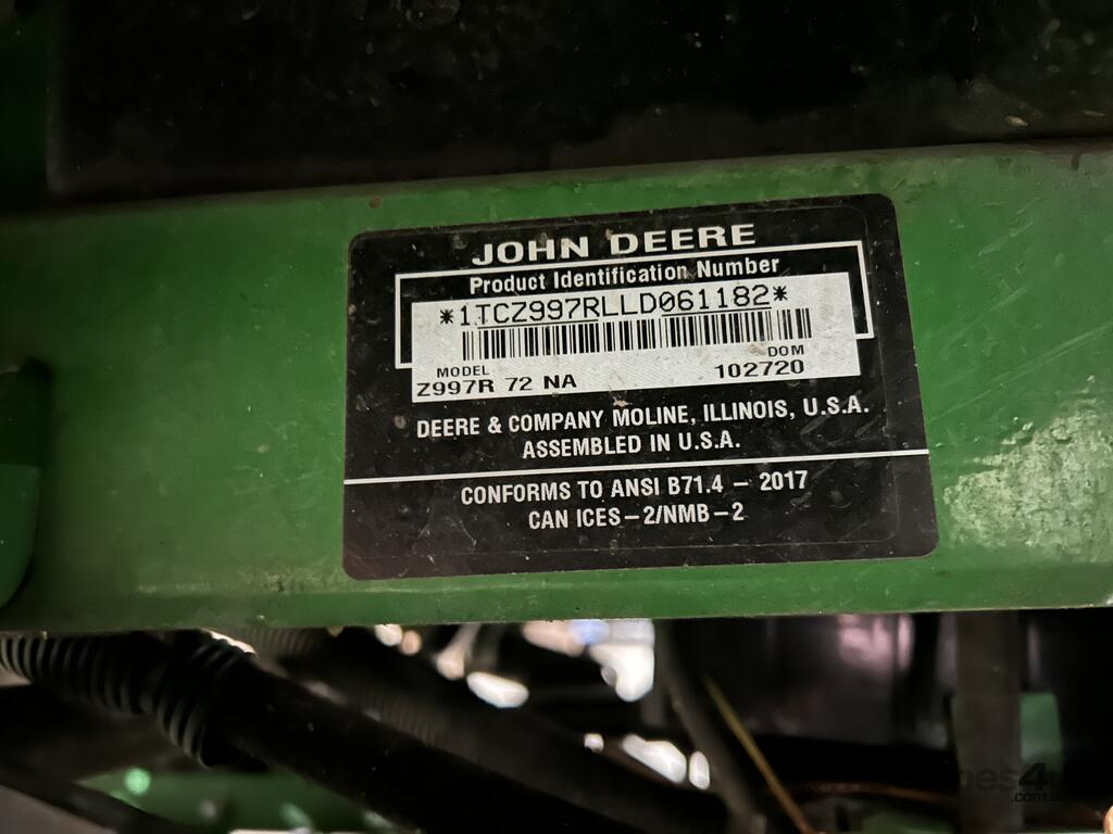 No C/P,John Deere,Z997R,Ride On Mower,Diesel,Odometer not visible,1596 (Hrs. Showing on Hour meter),Colour: Green,Unregistered,Serial No: 1TCZ997RLLD061182,Sold with No Plates