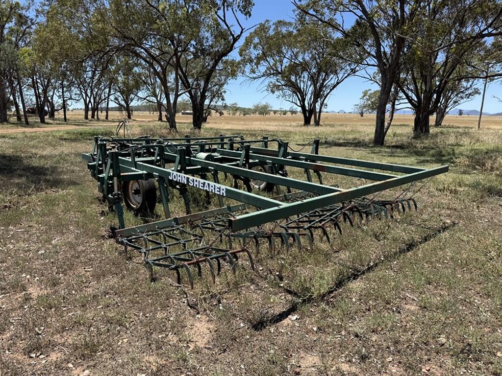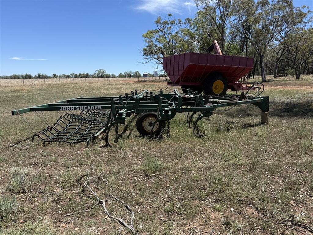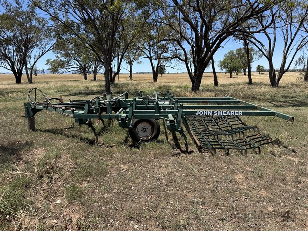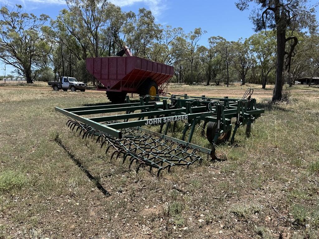 John Shearer Chisel Plough. Sold with trailing harrows. Located at Bellata NSW, available at MRE Auctions online sale.