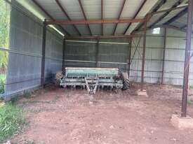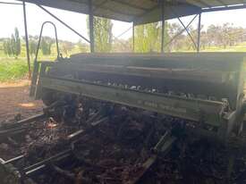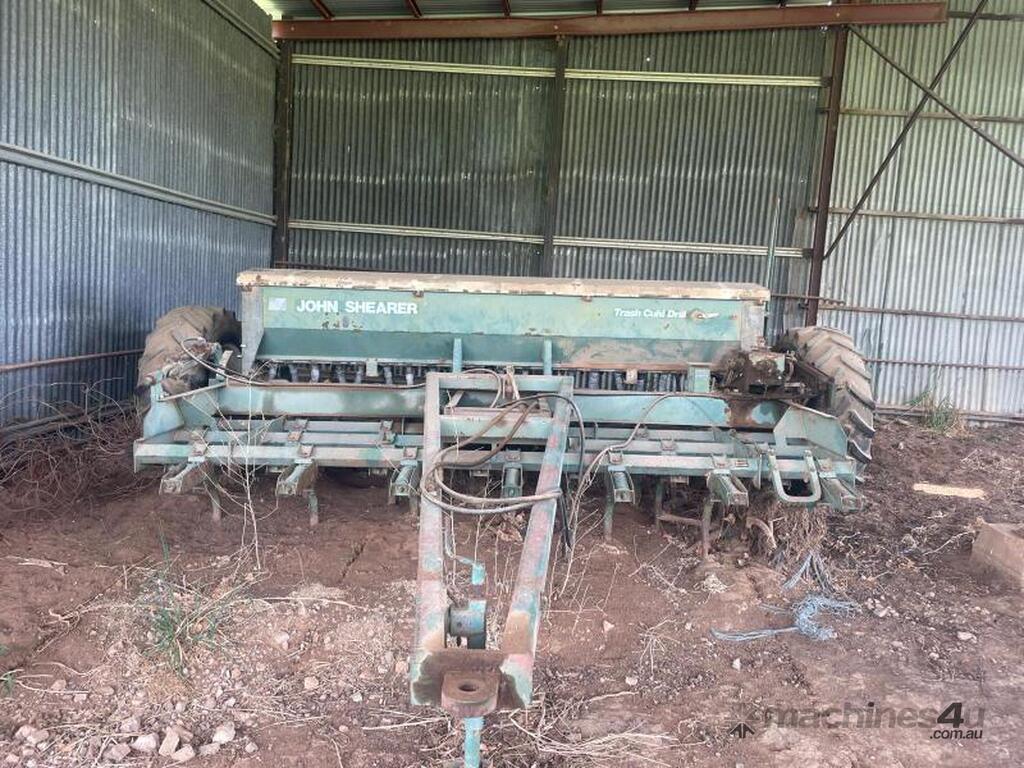 John Shearer Trash Culti Drill Seeder Has been sitting in shed for 6 years Parked up in working condition but hasn't been used since As far as vendors knowledge, seeder is in good working condition Hydraulic attachment Typical leak in gearbox seals Has harrows attached to unit