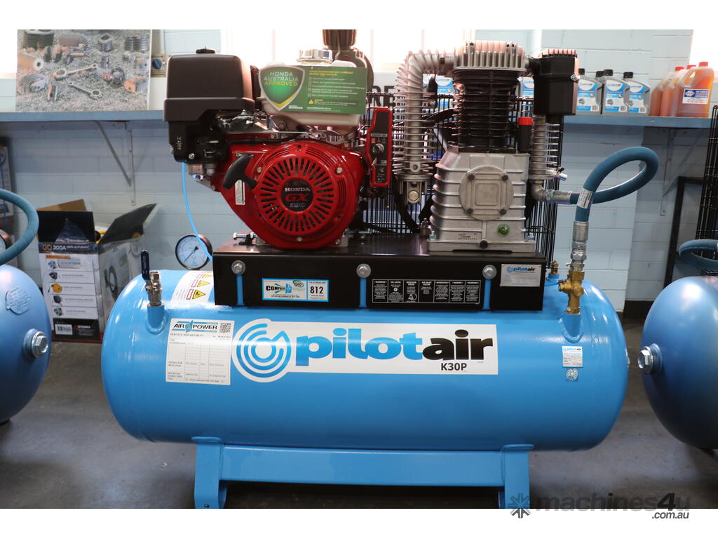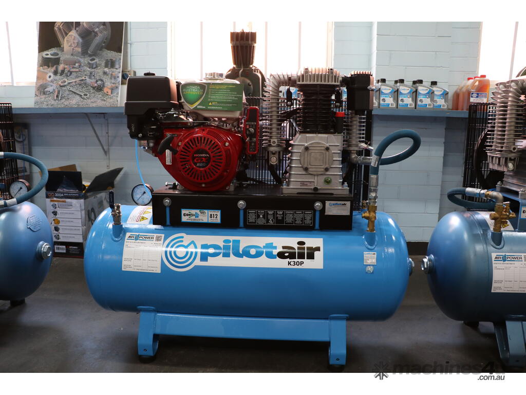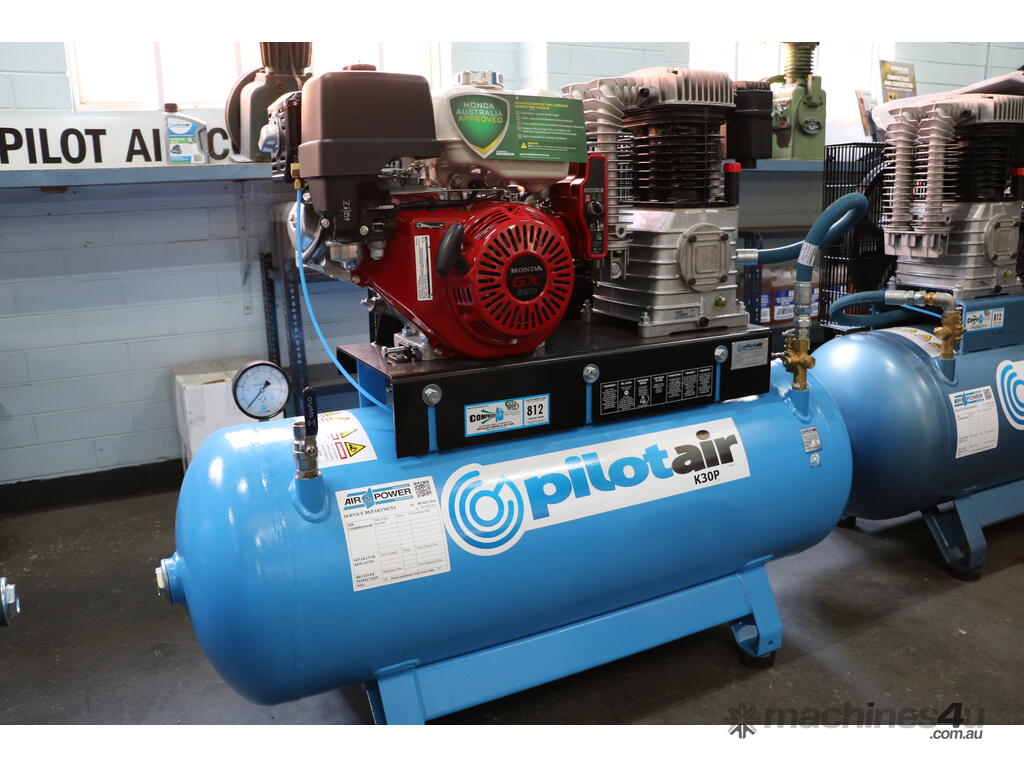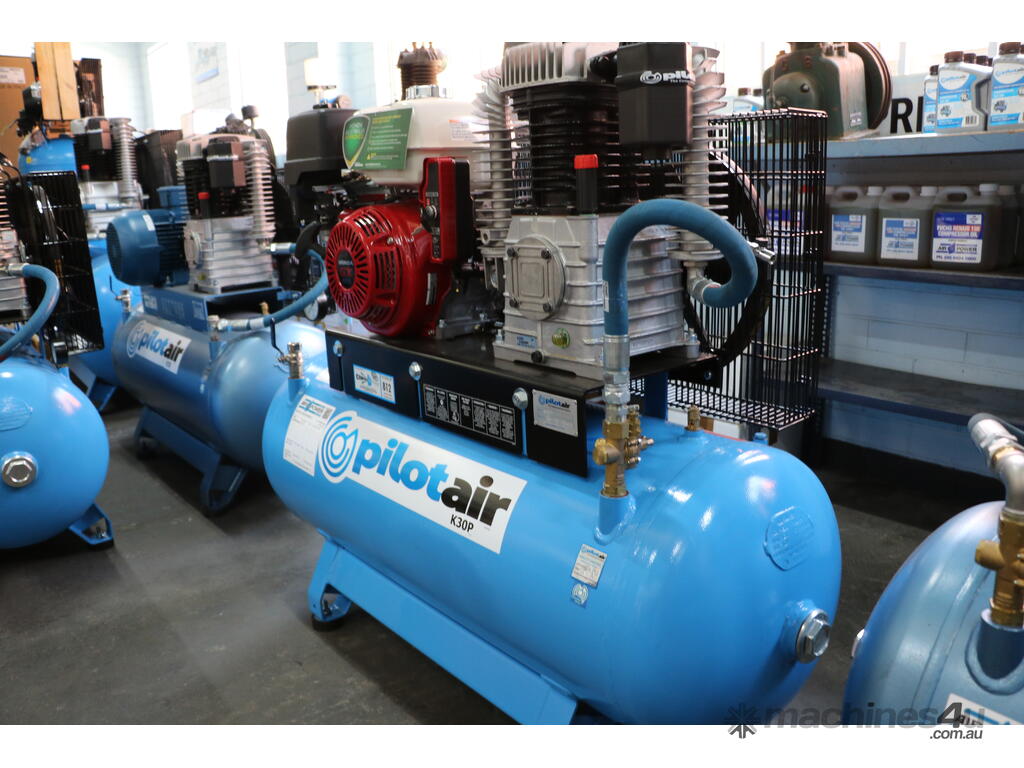 The K30P Classic Industrial Series Trade Petrol Electric Start Reciprocating air compressor, a member of the petrol series, is crafted in Australia and features the quality assurance of Pilot Air. It's engineered for heavy-duty applications, providing reliable compressed air right where it's needed, along with Pilot Air's famed durability and value.