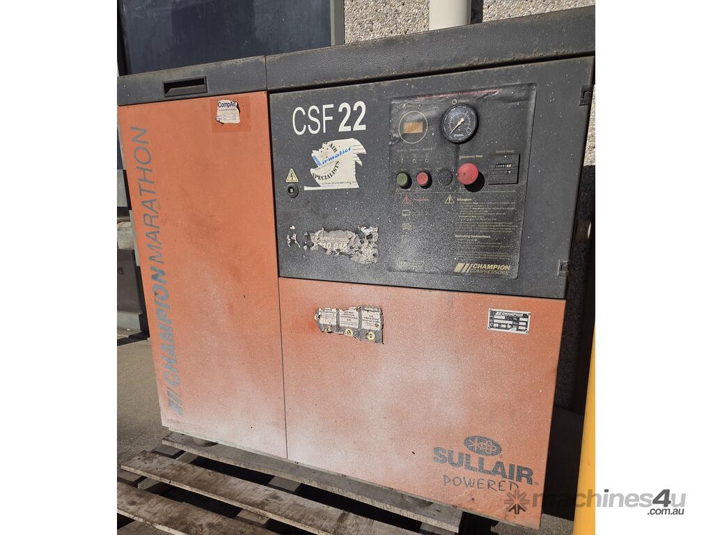 7). CHAMPION MARATHON CSF 22 by SULLAIR 22kw 30hp 415v 7.8 BAR 131CFM ROTARY SCREW COMPRESSOR Year 2004, MADE IN AUSTRALIA FOR AUSTRALIAN CONDITIONS, ITALIAN AIREND, GENUINE 10,957 HOURS, GOOD CONDITION. COSMETICALLY BLEMISHED BY OVERSPRAY. PRICE REDUCED ACCORDINGLY. REQUEST BROCHURE.