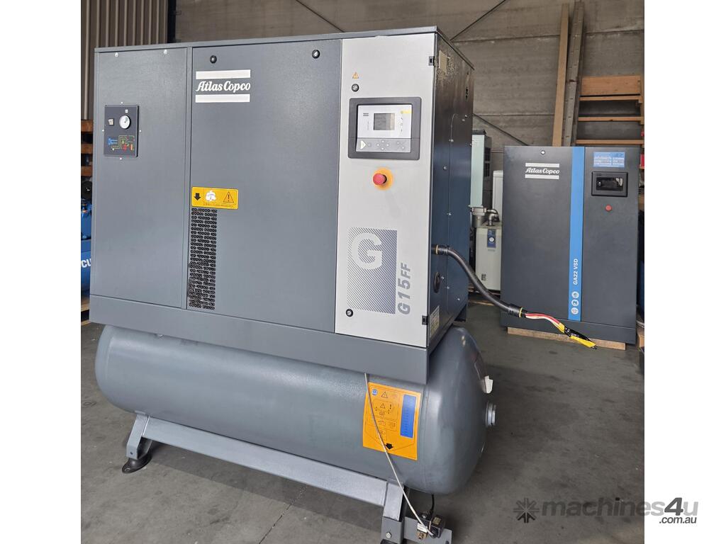3). ATLAS COPCO G15FF 15kw 20hp 415v 10 BAR 3-IN-1 FULLY-FEATURED ROTARY SCREW COMPRESSOR Year 2019 INCLUDING BUILT-IN REFRIGERATED AIR DRYER / 3 x FILTERS MOUNTED ON 500 LITRE AIR RECEIVER AIR TANK, VERY WELL MAINTAINED AND SERVICED IN LABORATORY ENVIRONMENT, GENUINE 18,174 RUN HOURS, AS NEW CONDITION