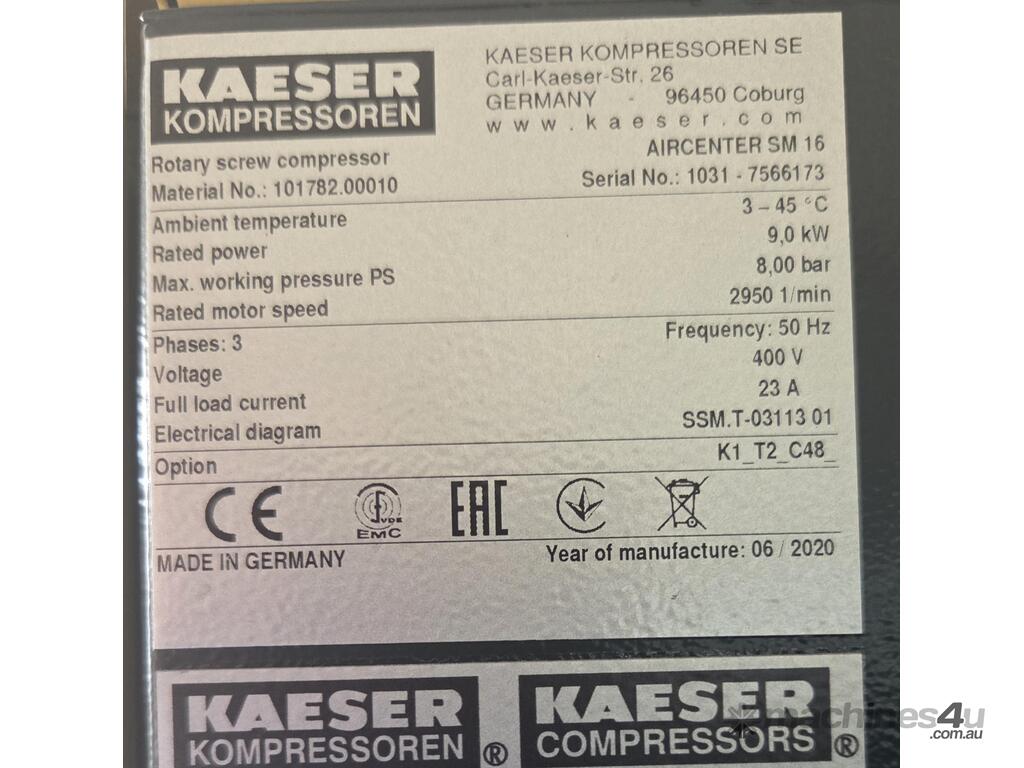 1). KAESER AIRCENTER SM16 9kw 12hp 415v 8 BAR 3-IN-1 FULLY-FEATURED ROTARY SCREW COMPRESSOR Year 6/2020 INCLUDING BUILT-IN REFRIGERATED AIR DRYER / FILTERS MOUNTED ON 270 LITRE AIR RECEIVER AIR TANK, SIGMA 2 ELECTRONIC CONTROLLER, RFID SERVICE OPTION INCLUDING SWIPE CARD, MADE IN GERMANY, VERY LOW RUN HOURS, SUPER QUIET, HEAVY DUTY, VERY COMPACT FOOTPRINT, 1 OWNER, AS NEW CONDITION. REQUEST BROCHURE.