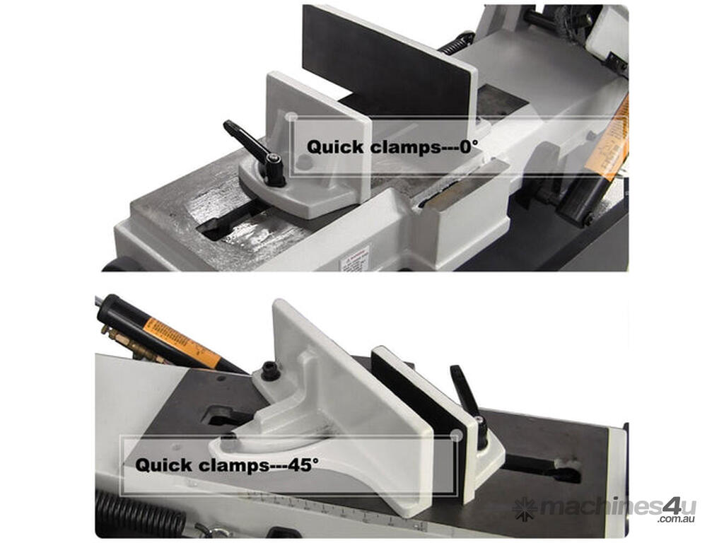 This horizontal/vertical band saw has all the features needed for professional results when it comes to metal cutting. The band saw features a built-in coolant system, a heat-treated high carbon steel blade, brass fittings and ball valves, a durable polypropylene tank, fully shielded guide bearings and a full complement of belt and blade guards for safety. The metal cutting band saw includes a convenient roller cabinet for easy storage and an automatic shut off when your cut is complete for safer cutting
