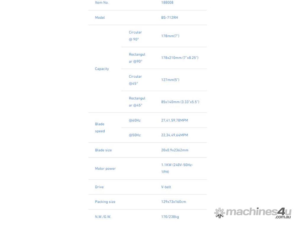 The maximum processing capability of BAND SAW BS-712R is 7"(178mm)