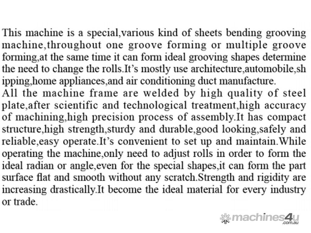 This machine is a special, various kind of sheets bending grooving machine, throughout one groove forming or multiple groove forming at the same time it can form ideal grooving shapes determine the need to change the rolls. It's mostly use architecture,automobile,sh ipping,home appliances, and air conditioning duct manufacture.