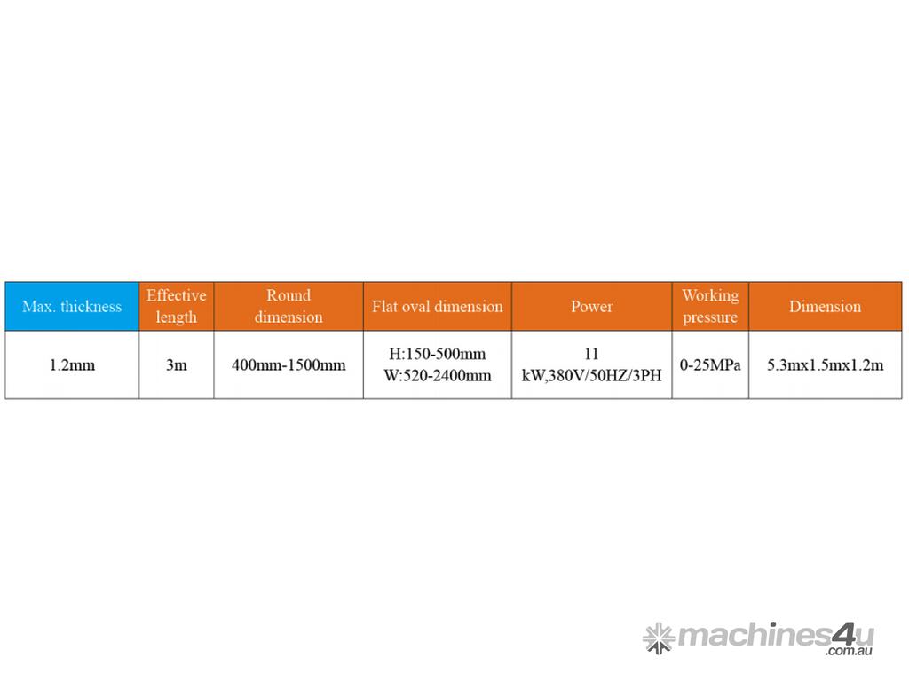 Using hydraulic force the machine will expand duct up to 3m long up to 800mm high and has adjustable width forming heads up to 500m for the ID of the duct.