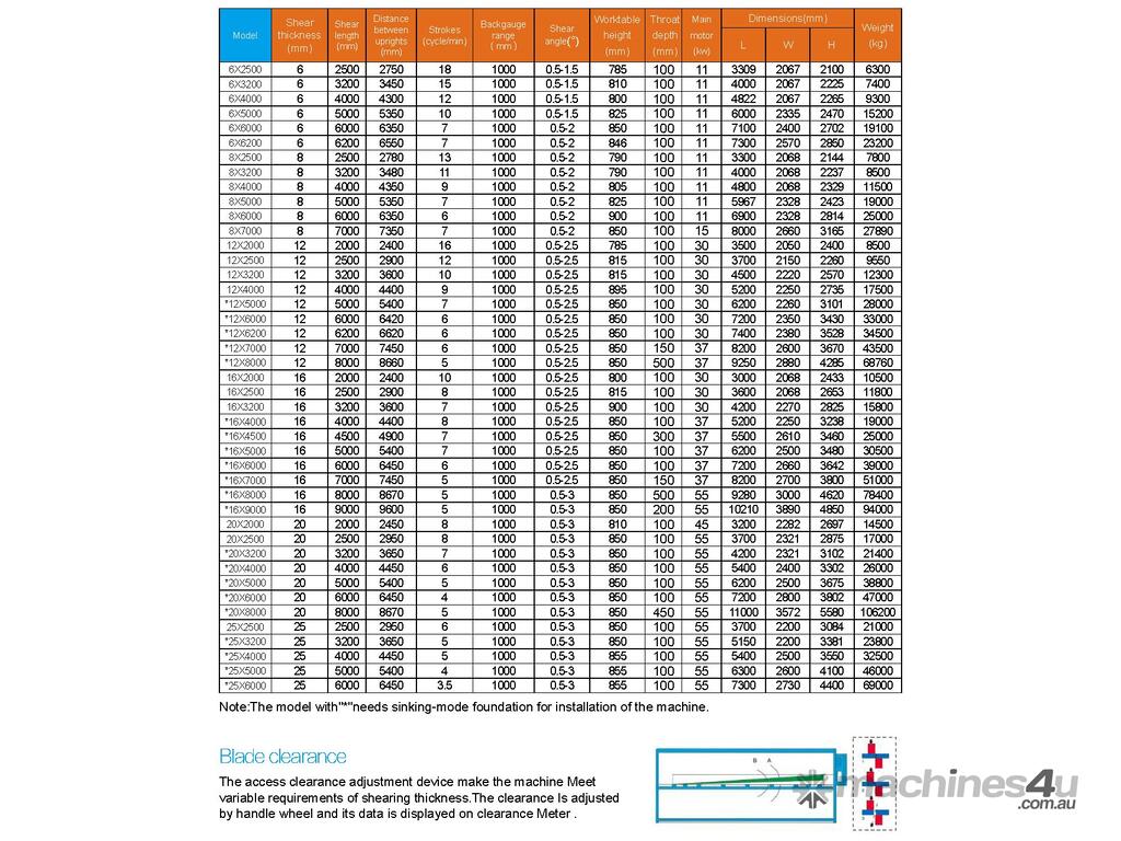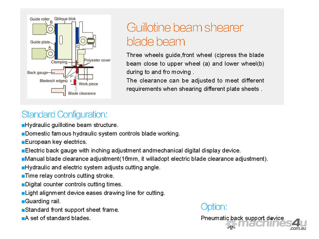 Manual blade clearance adjustment(16mm, it willadopt electric blade clearance adjustment) Hydraulic and electric system adjusts cutting angle.