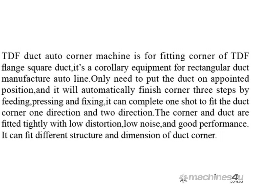 TDF duct auto corner machine is for fitting corner of TDF flange square duct,it's a corollary equipment for rectangular duct manufacture auto line. Only need to put the duct on appointed position, and it will automatically finish corner three steps by feeding, pressing and fixing,it can complete one shot to fit the duct corner one direction and two direction. The corner and duct are fitted tightly with low distortion, low noise, and good performance. It can fit different structure and dimension of duct corner.