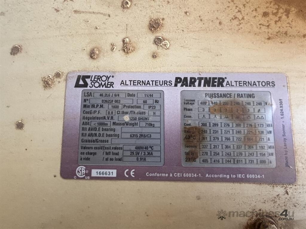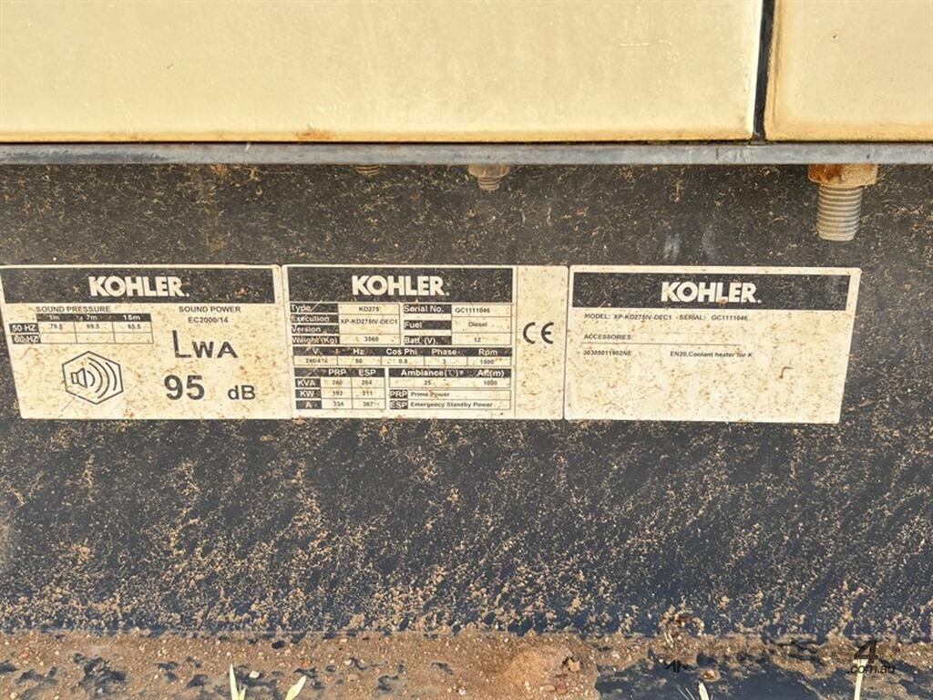 KOHLER KD275 GENERATOR, S/N: GC1111046, 8.1L John Deere engine, see images for specs, showing 1865 hrs, has recently been load tested and is all within spec, located Barrakee VIC