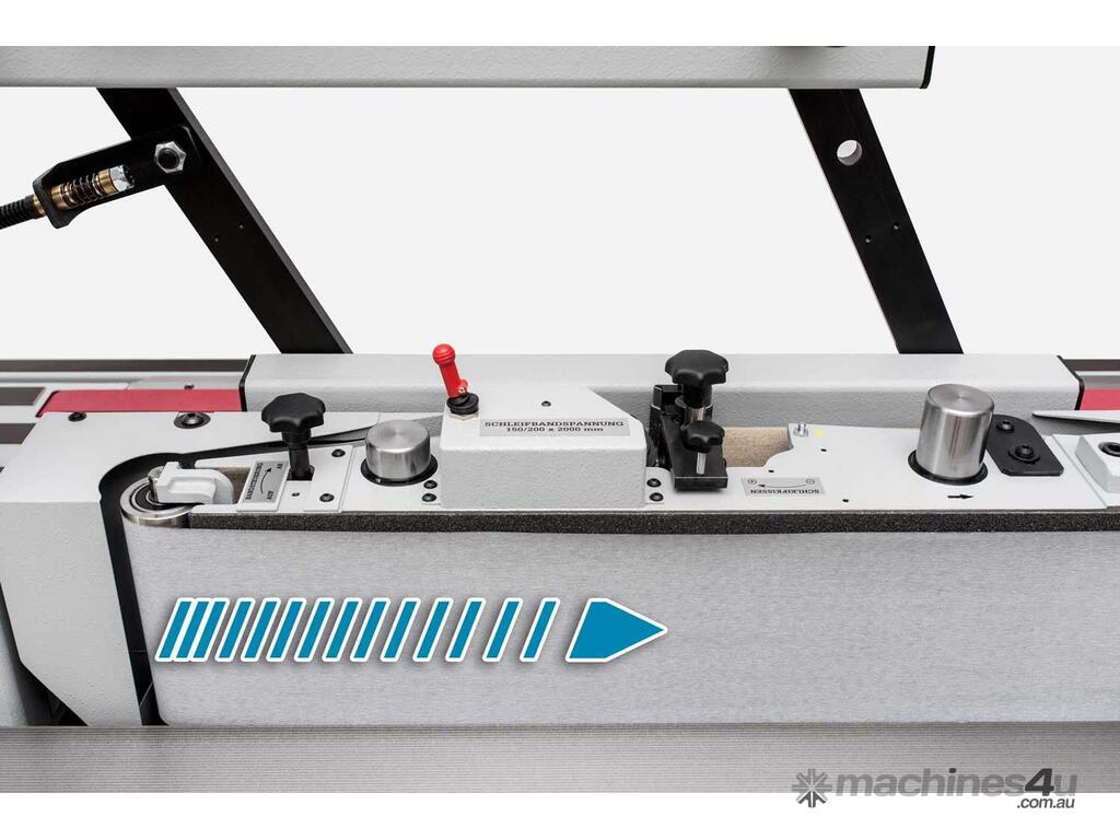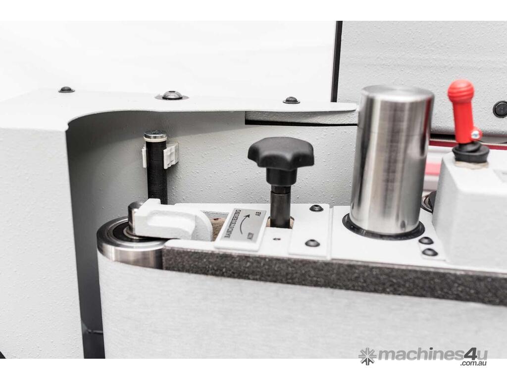 The integrated oil damper system, which acts on the tension roller, ensures that belts remain optimally tensioned even if there are differences in length due to manufacturing tolerances or the effects of moisture. The belt runs over a large-area graphite cloth. In order to reduce the wear on the graphite on the abrasive pad to a minimum, a deflection roller is installed to the left and right of it. The belt can also be changed with ease in seconds.