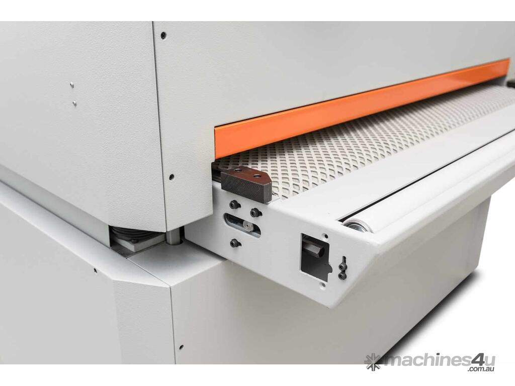 The sanding units are based on the proven combination of a calibration roller and a sanding pad unit. The two versions in which the Kündig Master is available are distinguished by the fine sanding pad unit (see below). For a safe workpiece guidance there is a parallel spring-loaded steel pressure roller at the machine infeed and rubber pressure rollers between the sanding units.