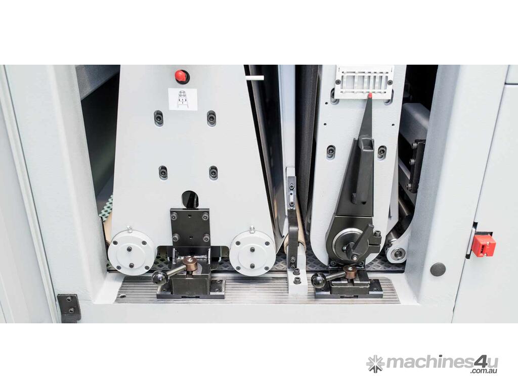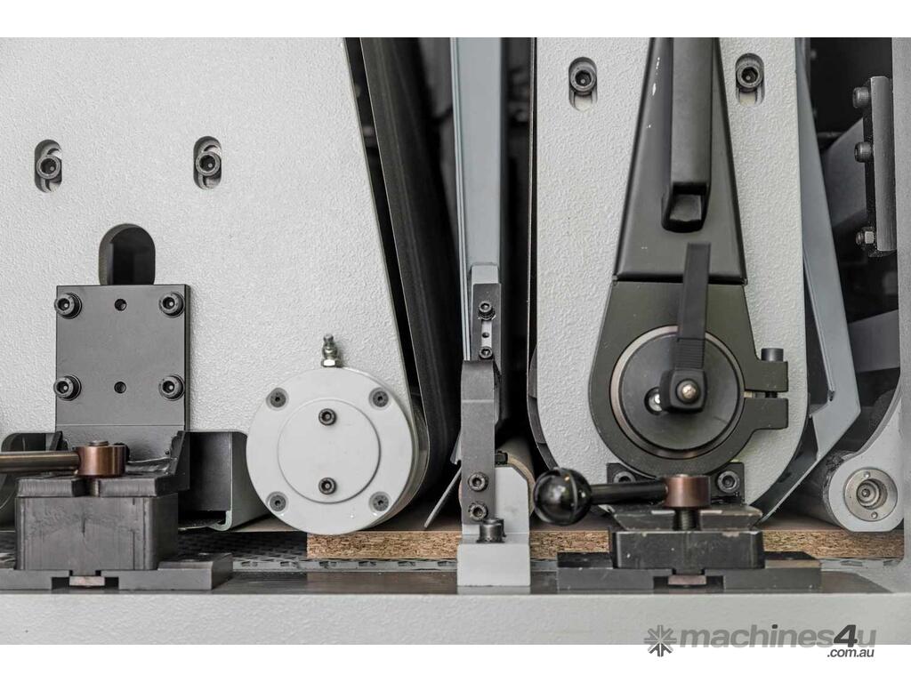 Segmented sanding pad (E): With the E-Plus package, the fine sanding unit has a segmented, electronically controlled sanding pad with workpiece detecting rollers 35 mm wide. This allows an even more precise fine sanding in the edge area of the workpieces. The edge pressure of the sanding segments is automatically controlled, but can also be adjusted on the touch-screen in order to influence the sanding around the edges of the workpiece even more precisely. Here too, the graphite cloth insert can be changed quickly and easily.