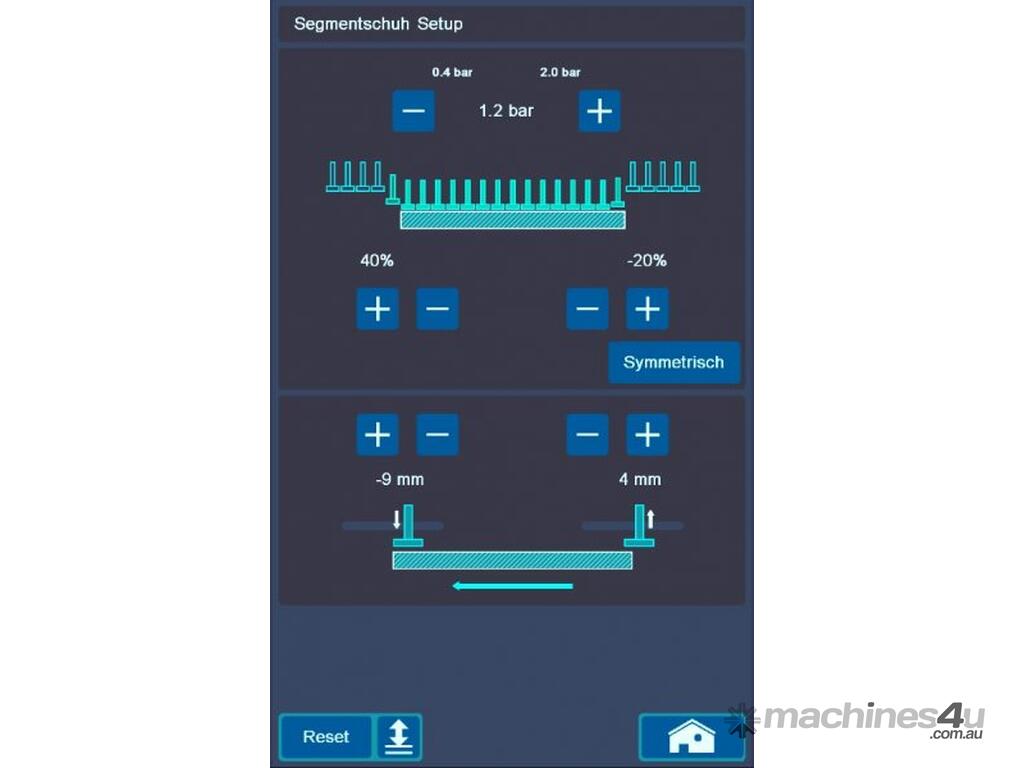 A segmented sanding pad is in an integral component of any lacquer wide belt sander. At Kundig, we do not only use 22mm (1 Inch) thin workpiece detecting rollers but the same small 22mm size sanding segments as well. Our software allows for easy and logical control of this complex precision-intrument. In the upper part of the screen the overall sanding pressure is adjusted. Below, the pressure on the workpiece edges can be regulated in percentage increments. Additional segments can even be added or subtracted on each side. Asymmetric adjustments, which means different edge pressure on each side, are possible as well. In order to specifically concentrate on either the front or rear end of the workpiece, the activation and retraction of the sanding segments can either be delayed or accelerated, which is easily controlled in the bottom window.