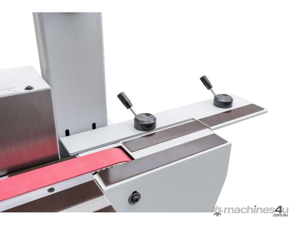 It is the feeding device that distinguishes the Uniq-S from the Uniq. The machine body integrated feeding system features a rubberized feed belt (a two-belt version is available as well) with variable speed between 3 and 15 m/min (9 - 45 ft/min). Its handling is, like everything on the Uniq-S, very simple: Place the workpiece on the table, fix it with the crank handle, start the feed. Afterwards, further workpieces of the same thickness can be simply placed on the belt. The feed system of the Uniq-S is ideally suited for sanding batches and is a helpful support when sanding or even producing chamfered or angled edges.