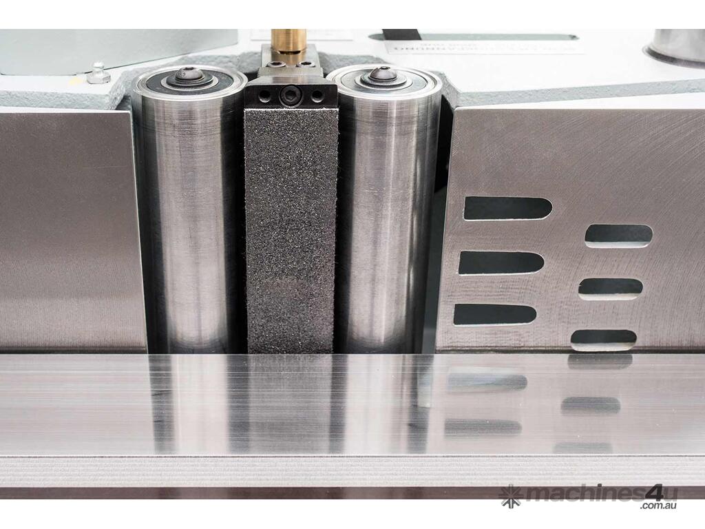 The integrated oil damper system, which acts on the tension roller, ensures that belts remain optimally tensioned even if there are differences in length due to manufacturing tolerances or the effects of moisture. The belt runs over a large-area graphite cloth. In order to reduce the wear on the graphite on the abrasive pad to a minimum, a deflection roller is installed to the left and right of it. The belt can also be changed with ease in seconds.