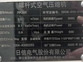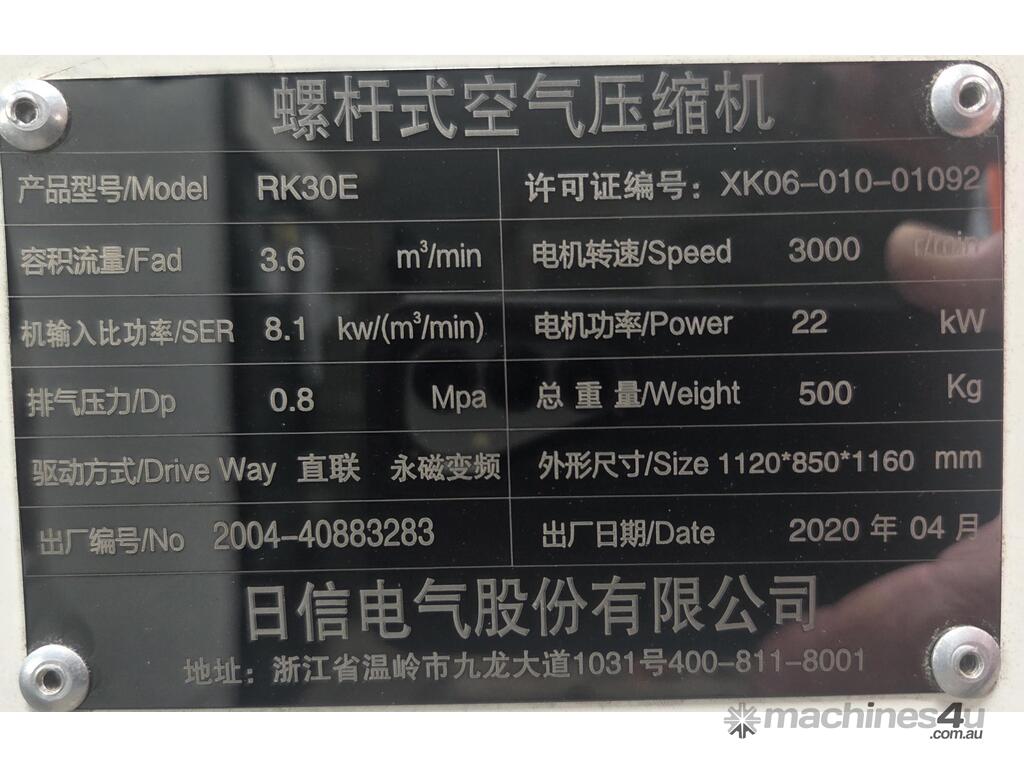 2). RK30E UNBRANDED 22kw 30hp 415v 8 BAR ROTARY SCREW COMPRESSOR BASE MOUNT Year 2020 IMPORTED BY MEDICAL BUSINESS ‘TACCA MEDICAL’ IN SYDNEY, NOW SURPLUS TO REQUIREMENTS. GENUINE LOW HOURS. HEAVY DUTY TRANSPORTABLE CABINET. IN AS NEW CONDITION. BARGAIN! QUICK SALE