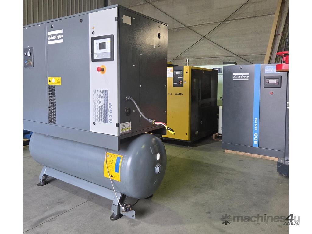 3). ATLAS COPCO G15FF 15kw 20hp 415v 10 BAR 3-IN-1 FULLY-FEATURED ROTARY SCREW COMPRESSOR Year 2019 INCLUDING BUILT-IN REFRIGERATED AIR DRYER / 3 x FILTERS MOUNTED ON 500 LITRE AIR RECEIVER AIR TANK, VERY WELL MAINTAINED AND SERVICED IN LABORATORY ENVIRONMENT, GENUINE 18,174 RUN HOURS, AS NEW CONDITION
