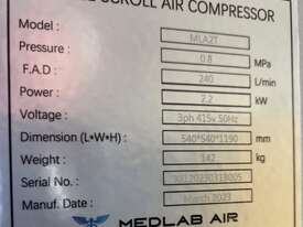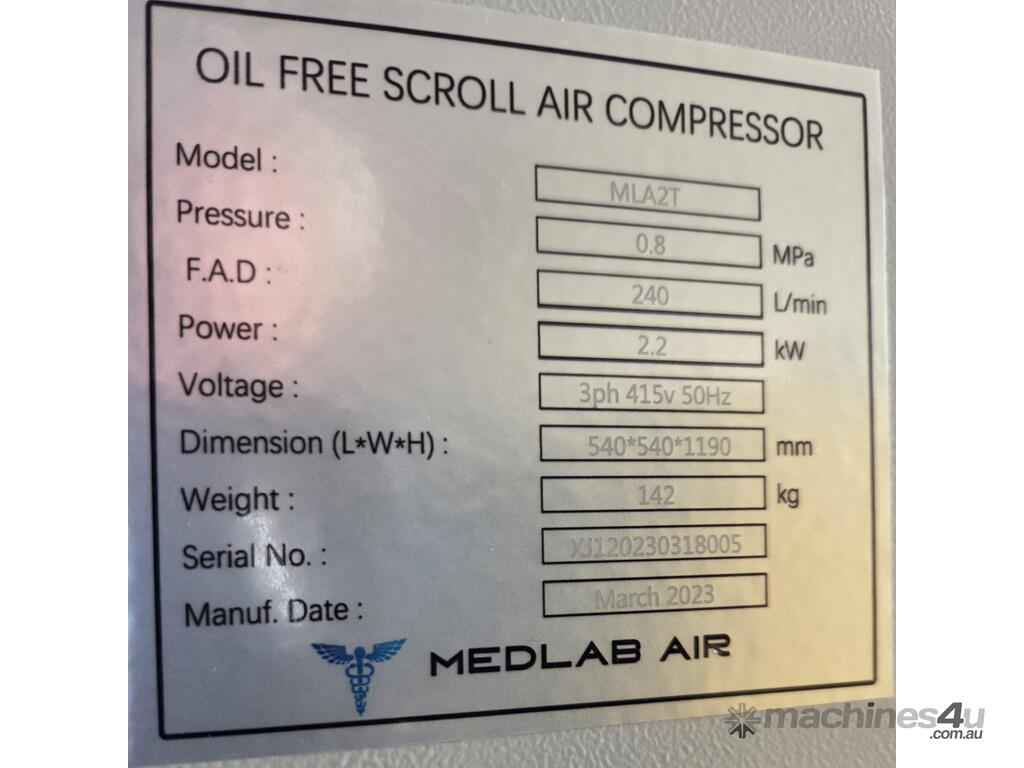 4). MEDLAB MLA-2T 2.2kw 3hp 415v 10 BAR OIL-FREE SCROLL COMPRESSOR INDUSTRIAL QUALITY, BRAND NEW, ULTRA SILENT, 100% CLASS ZERO AIR, DIGITAL CONTROLS, SUIT MEDICAL, PHARMACEUTICAL, FOOD INDUSTRIES, ELECTRONICS, ROBOTICS etc. REQUEST 'SULLAIR' BROCHURE FOR GENERAL OVERVIEW OF FEATURES, TOP QUALITY, RARE OPPORTUNITY – FRACTION OF REPLACEMENT COST $ 11,991+ - POA. REQUEST EXTRA PHOTOS.
