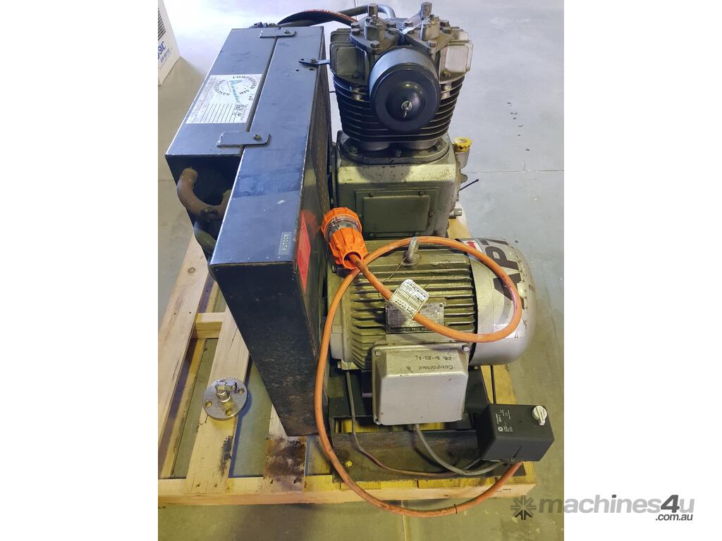 5). CHAMPION AP7 5.5kw 7.5hp 415v INDUSTRIAL RECIPROCATING AIR COMPRESSOR BASE MOUNT INCLUDING AFTERCOOLER FAN UNIT, HEAVY DUTY CAST IRON PUMP MADE IN ITALY, VERY GOOD ORIGINAL CONDITION