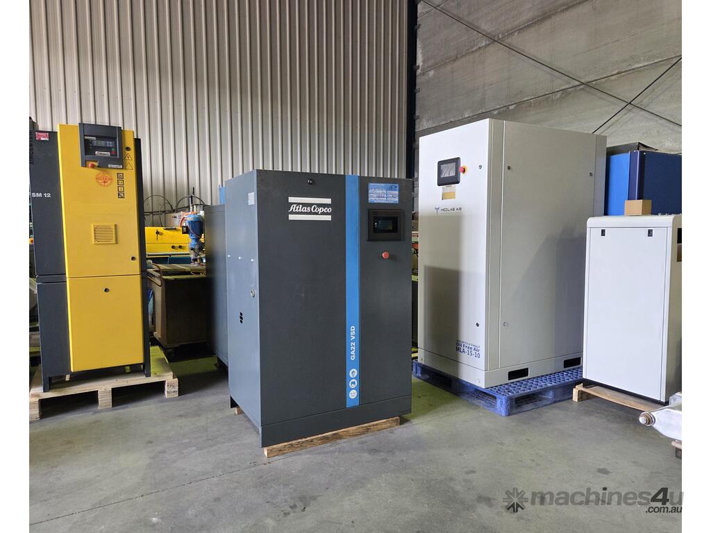 3). ATLAS COPCO GA22 VSD 22kw 30hp 415v 8-13 BAR 138CFM VARIABLE SPEED ROTARY SCREW COMPRESSOR BASE MOUNT Year 10/2020, GENUINE LOW 5,500 RUN HOURS (TBC), REGULARLY SERVICED INCLUDING RECENT OIL SEPARATOR REPLACEMENT. HUGE PRICE REDUCTION! TESTED SHOWING OIL LEAK FROM DIRECT DRIVE ELECTRIC MOTOR, REPAIRABLE.