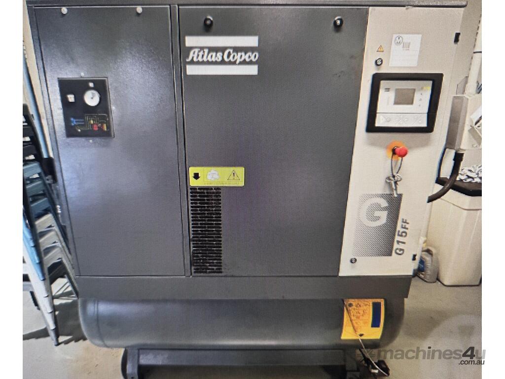 2). ATLAS COPCO G15FF 15kw 20hp 415v 10 BAR 3-IN-1 FULLY-FEATURED ROTARY SCREW COMPRESSOR Year 2019 INCLUDING BUILT-IN REFRIGERATED AIR DRYER / 3 x FILTERS MOUNTED ON 500 LITRE AIR RECEIVER AIR TANK, VERY WELL MAINTAINED AND SERVICED IN LABORATORY ENVIRONMENT, GENUINE 18,174 RUN HOURS, AS NEW CONDITION
