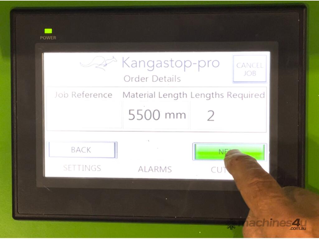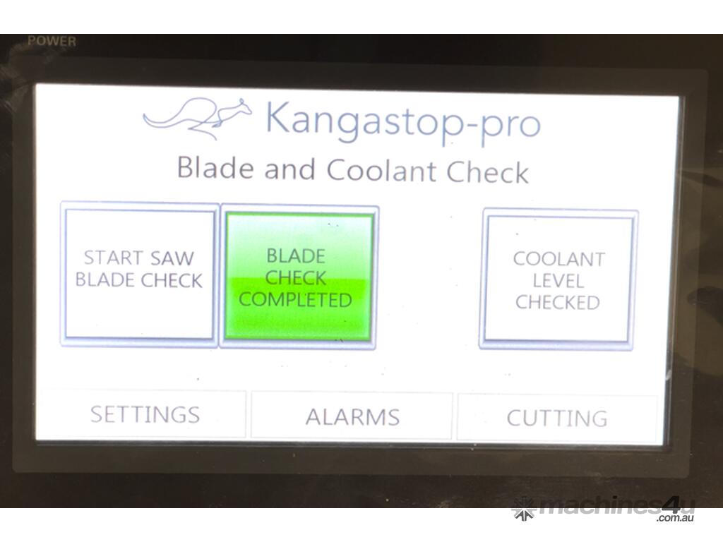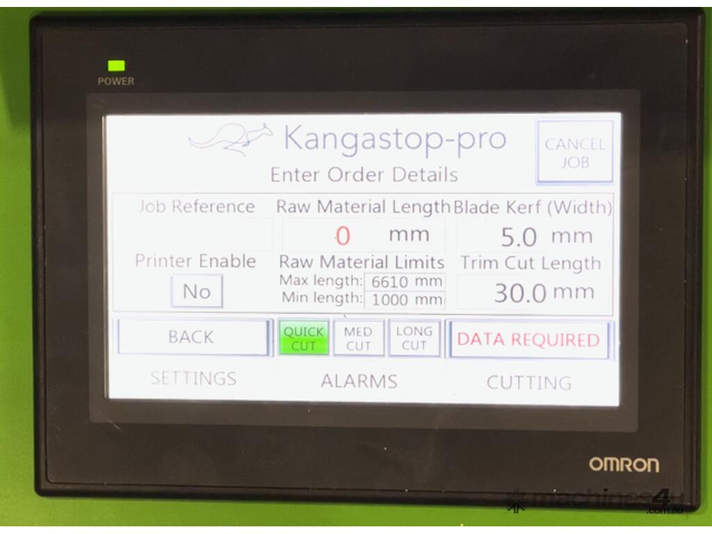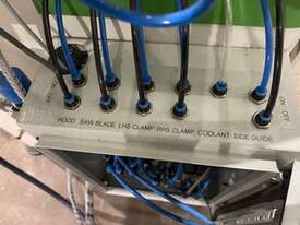 The Kangastop Pro supports USB pre-loading of cutting lists (in development) and uses comprehensive automation to control Festo pneumatic valves for safety hood, infeed and outfeed clamp control, coolant delivery and side roller operation.