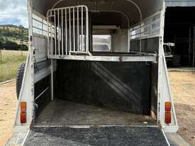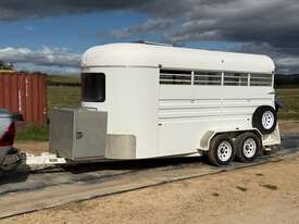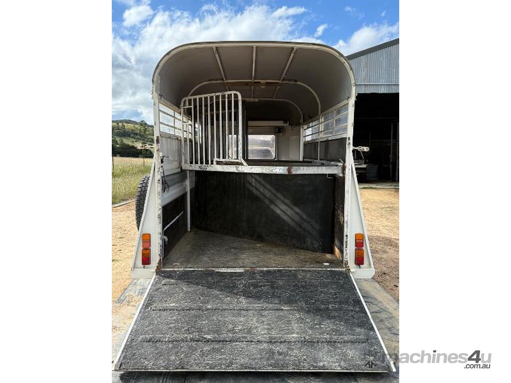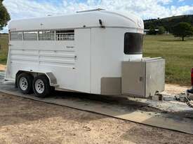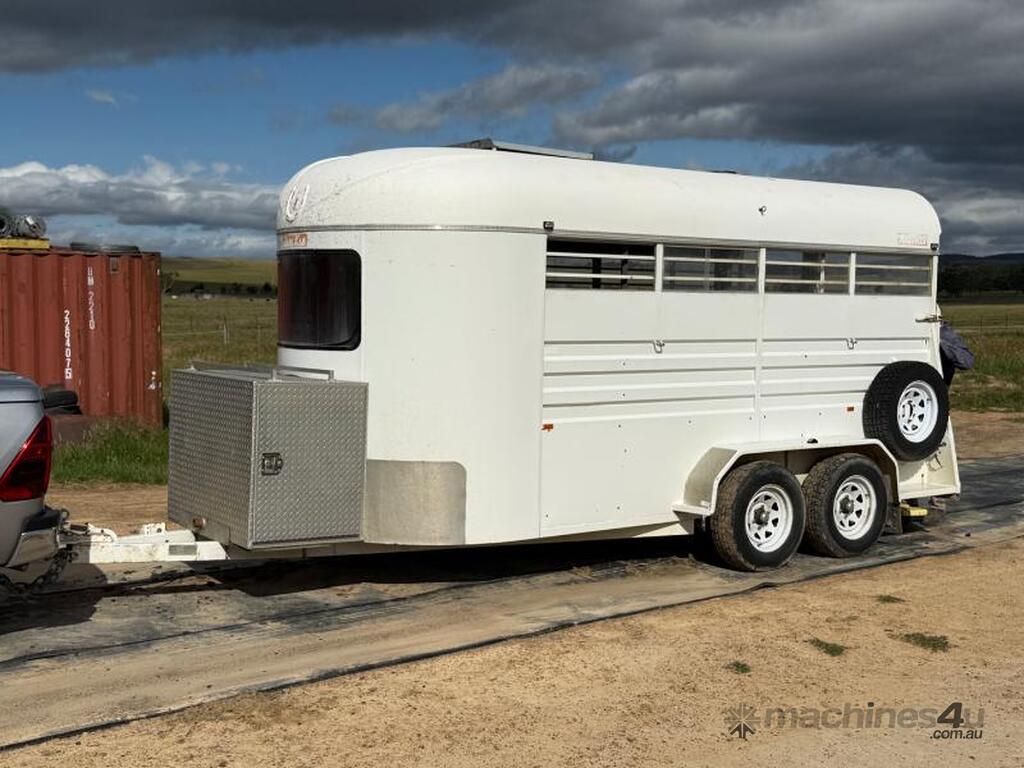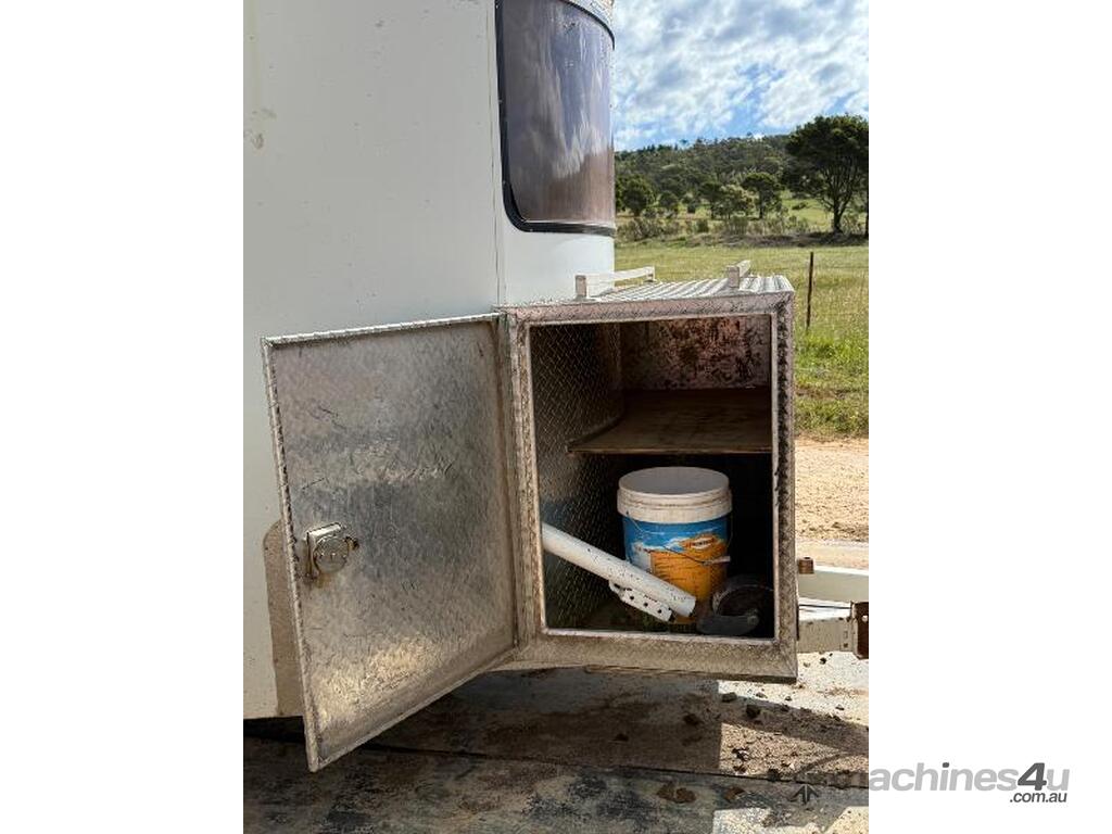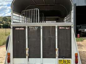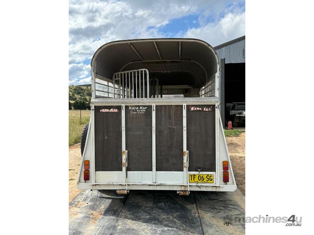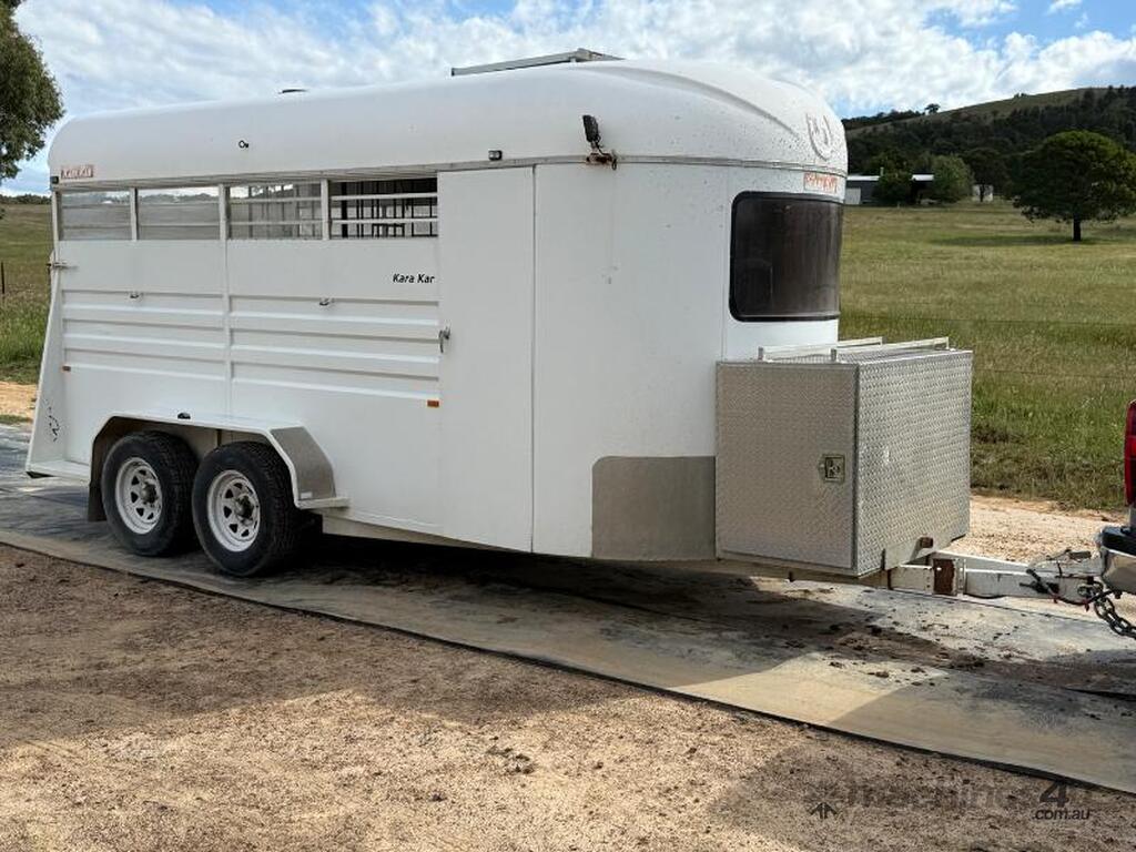 Kara Kar Horse Float. 4 Horse Angle Load. Rego to March 2026. 2009 YOM, Tare 1350kg. Solar and battery, runs internal lights and 80L Eva Cool Fridge. Gas Stove. Chequer Plate Tac Box, Tyres are 95% and Electric Brakes.