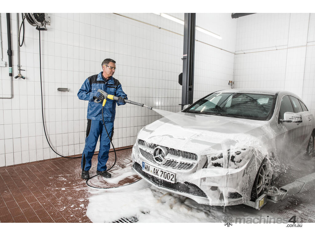 The hot water high-pressure cleaners of the new middle- and super-class convince with their 6 main features. 1. Environmental protection Greater efficiency with the new ECO mode, service switch for controlling water hardness, turbo fan, precision detergent metering, optimized burner technology and a high-efficiency pump. 2. User friendliness This is ensured by a central, clearly arranged control panel designed for intuitive operation, a spray lance holder, LED display, an integral, low-friction hose reel for 20 metres hose that swivels through 180°, and much more. 3. Cleaning performance Highly efficient cleaning is guaranteed by patented nozzle technology, ceramic pistons, turbo fan as well as increased pump efficiency. Accessories are optimized for specific applications and designed to exactly suit customer requirements. 4. Mobility The mobility concept features two casters, large rubber-tyred wheels, ergonomic handles, lifting points for handling with a forklift, lashing rings and a recessed tread for tilting the machine to guarantee maximum manoeuvrability. 5. Reliability Guaranteed by flue gas monitoring, a corrosion-proof, flexurally stiff, robust chassis, machine protector system, three-piston axial pump with ceramic pistons, heat resistant flue outlet, and much more. 6. Service friendliness Easy access to all components that require servicing and a service switch to call up operating data at any time for troubleshooting.