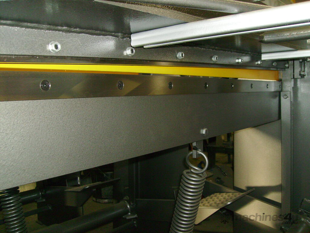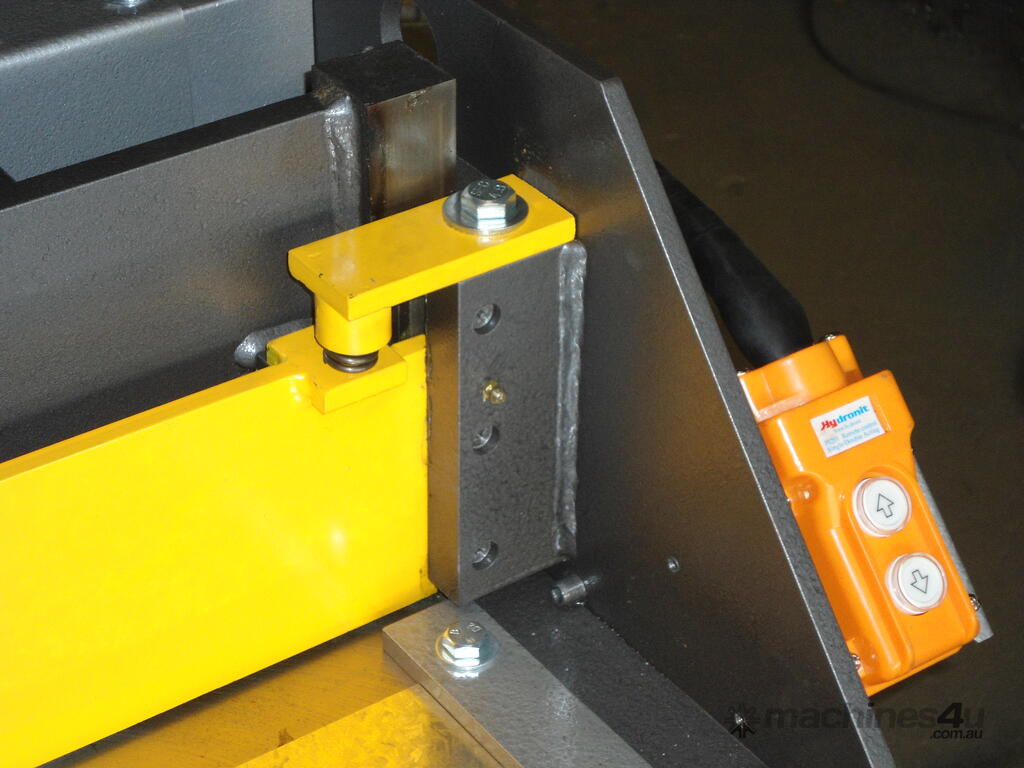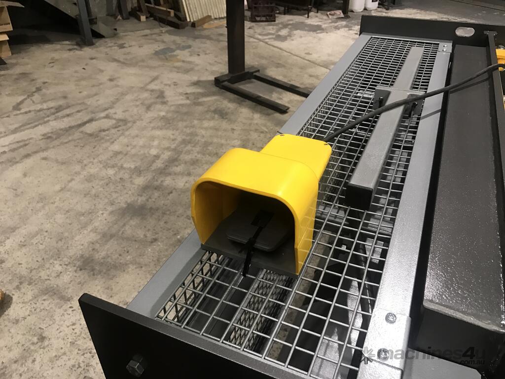 New single-phase 10 amp hydraulic guillotine with a cutting capacity of 1250mm x 1.6mm (3mm for aluminum). This machine is equipped with comprehensive safety features including full guarding, backstops, square arm, and front arm supports. The flat top machined bed and high-quality stainless blades ensure precise cutting. It also includes a convenient roving foot pedal for ease of use.