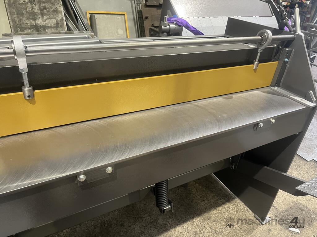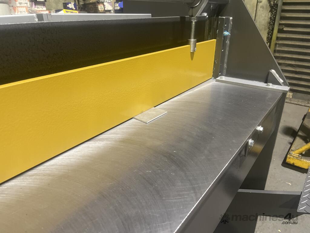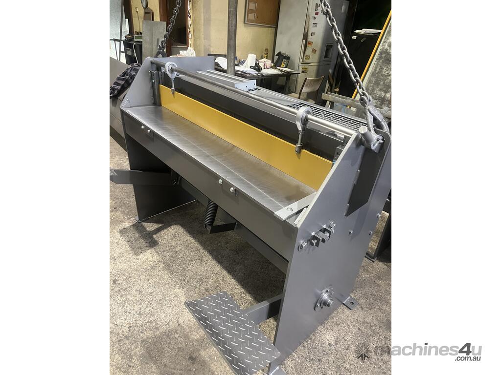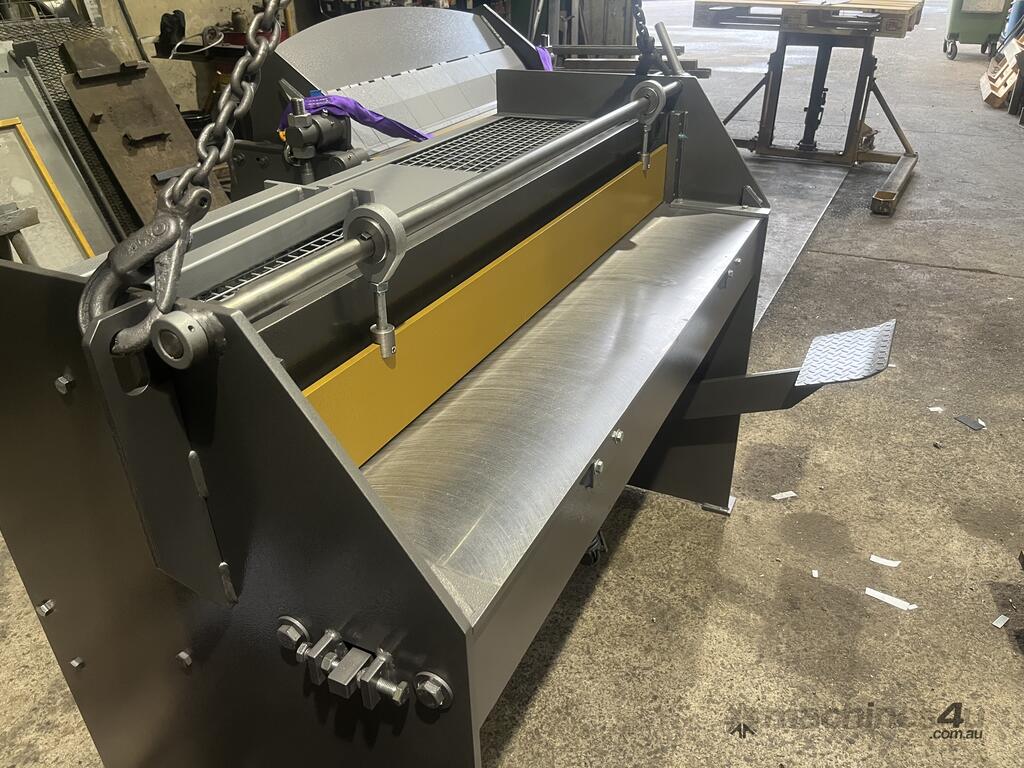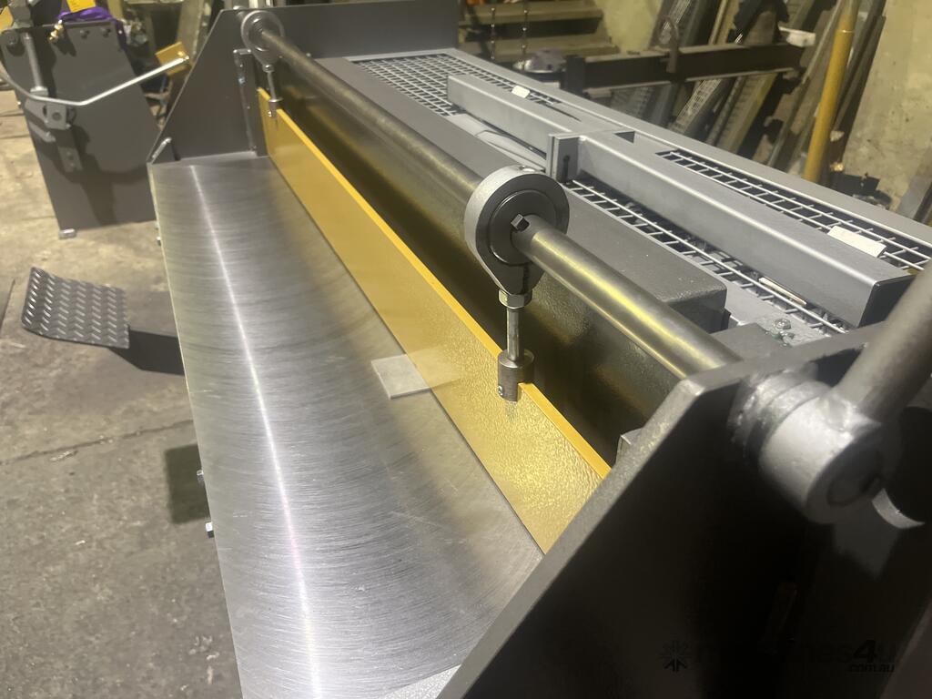 Heavy duty treadle guillotine with overhead manual clamp and longer leverage pedals we are able to shear 2.5mm material, I have cut shorter pieces of 3mm .