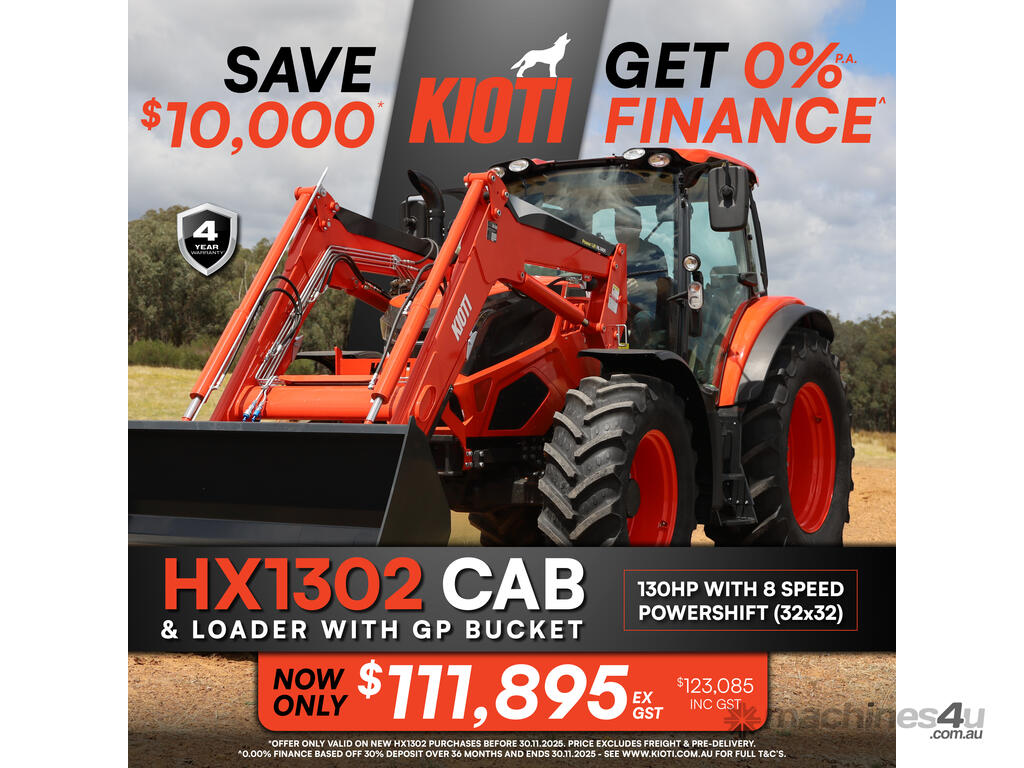 *$10,000.00 Factory Rebate & 0% Finance - This offer is only available on purchase with a new Kioti HX1302 Series tractor, 0% Finance based off 30% deposit over 36 months and ends 30.11.2025.