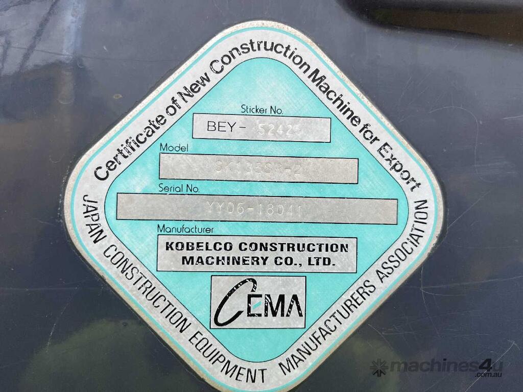 No C/P,Kobelco,SK135R-1E,Excavator,Engine #: D04FR-012589,4 Cyl,Diesel Turbo,Odometer not visible,Hourmeter not visible,Colour: Green,Rego. No: 11213E NSW,Serial No: YY08-1841,Sold with No Plates,WOVR Status: WOVR N/A,Incident Type: Fire