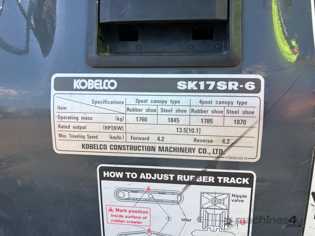 No C/P,Kobelco,SK17SR-3,Rubber Tracked Excavator,Diesel,Odometer not visible,Hourmeter not visible,Colour: Green,Rego. No: NP(9055C0), Unregistered,Serial No: PU12-00801,Sold with No Plates,WOVR Status: WOVR N/A,Incident Type: Malicious