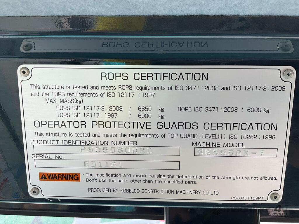 No C/P,Kobelco,SK55SRX-7,Excavator (Rubber Tracked),Diesel,Odometer not visible,1102 (Hrs. Showing on Hour meter),Colour: Green,Unregistered,Serial No: PS05060920,ROPS No: R01121,Sold with No Plates,WOVR Status: WOVR N/A,Incident Type: Impact