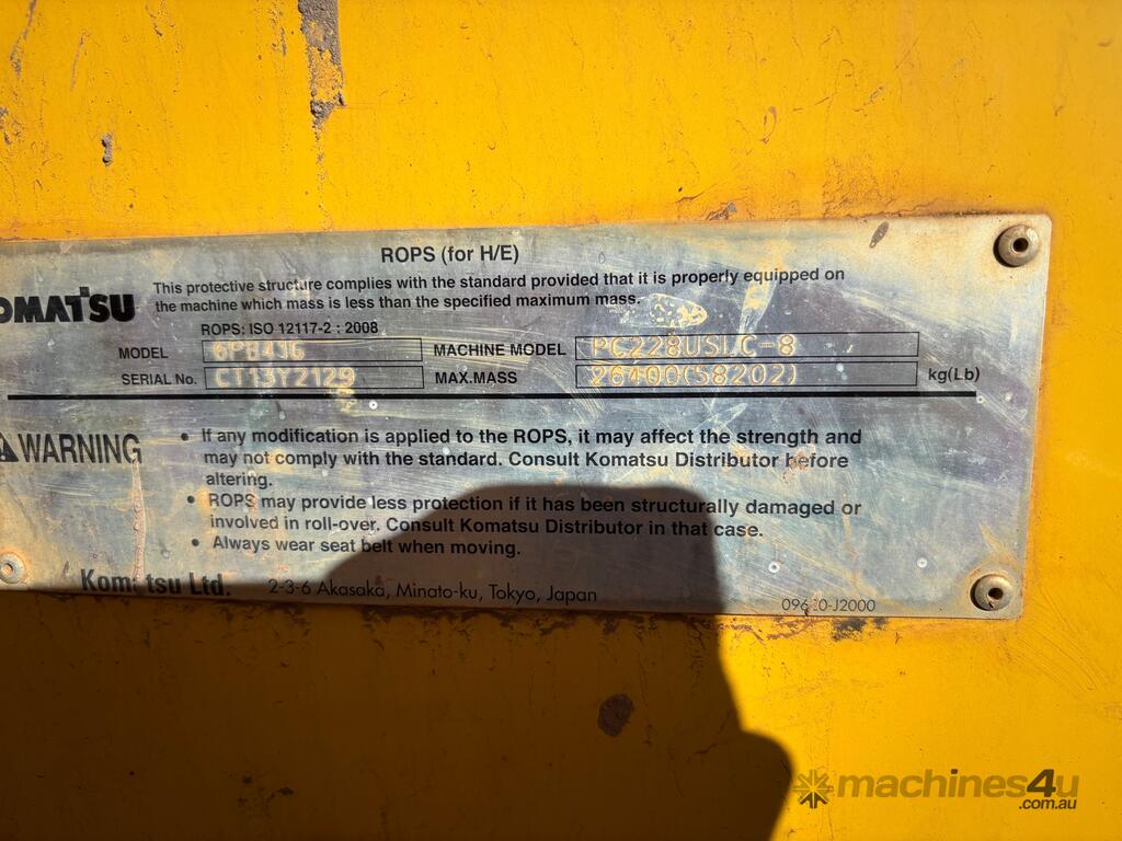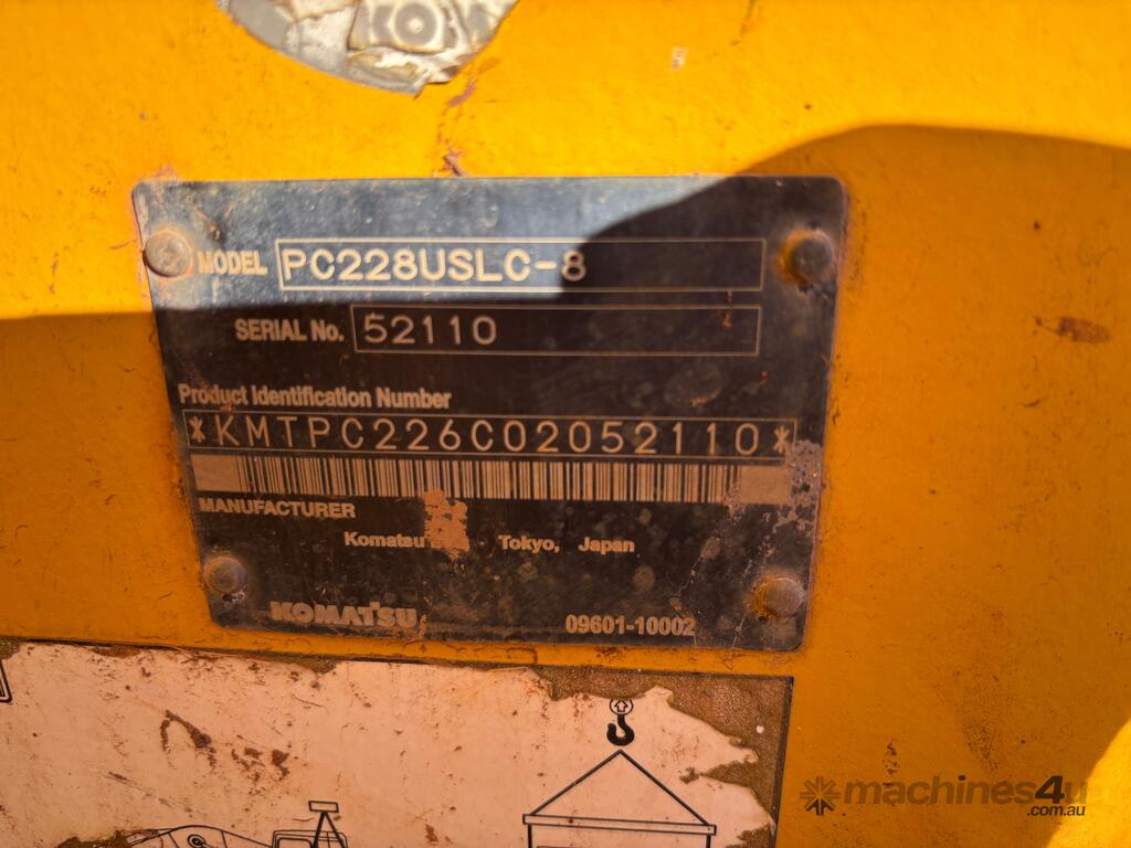 CP: null,Komatsu,PC228USLC-8,Excavator (Steel Tracked),Diesel,Odometer not visible,4442 (Hrs. Showing on Hour meter),Unregistered,VIN: KMTPC226C02052110,Serial No: 02052110,Sold with No Plates