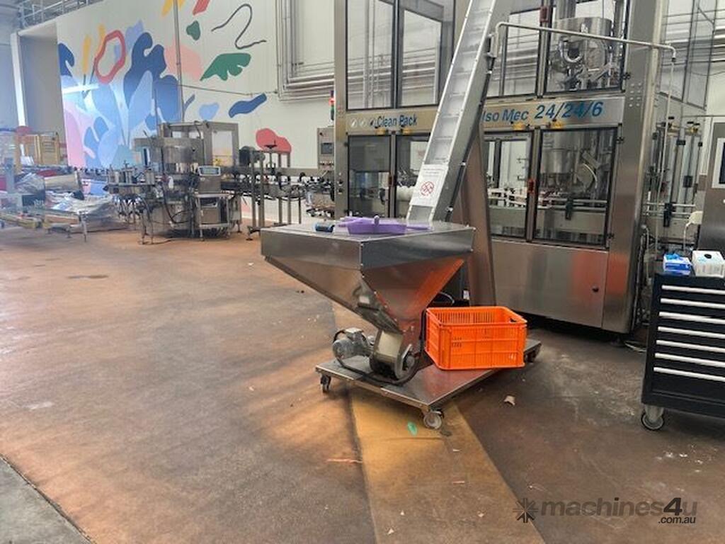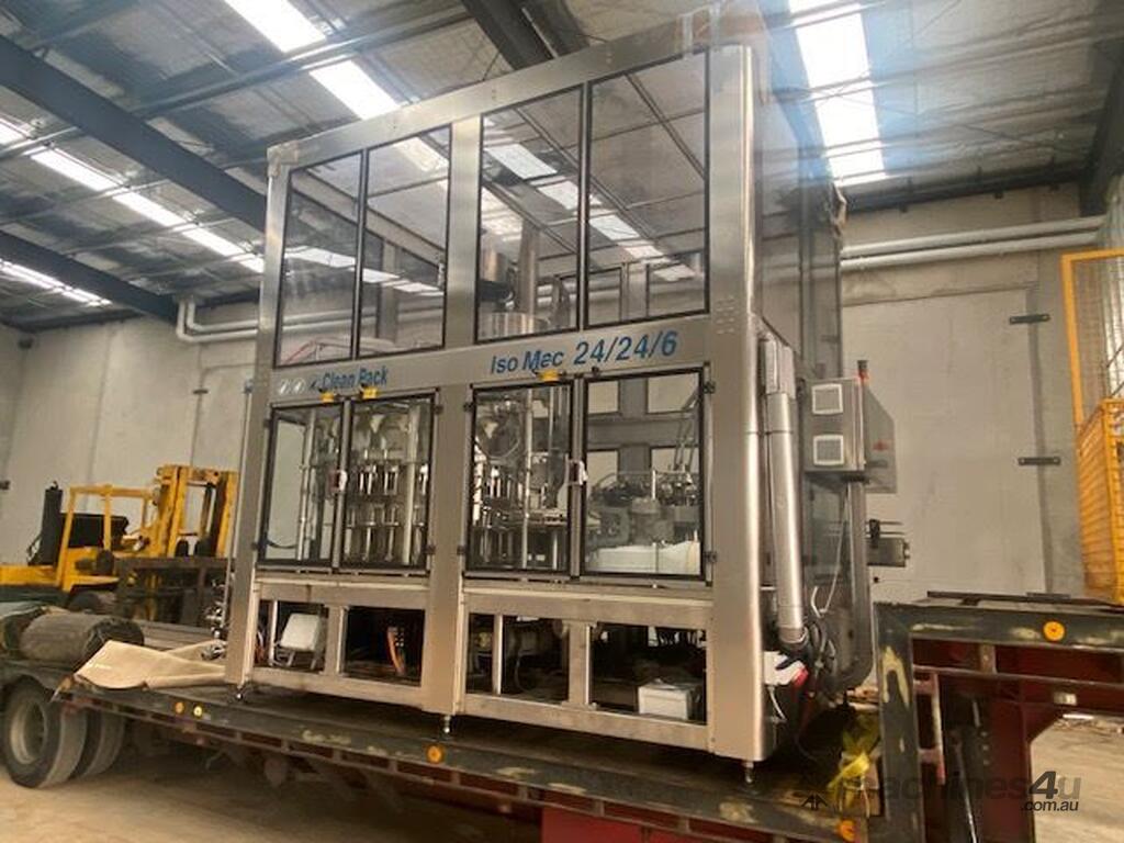 ISO MEC 24 / 24 / 6 AV – PF PP Bottle Filler. Suitable to bottle KOMBUCHA into GLASS and PET BOTTLES by means of a THREE-BLOCK composed by a 24 head gripper rinsing turret, a 24 valve counter pressure filler and a 6 head capper Pick and place which can do ROPP and PRE-THREADED CAPS. Aluminium cap and plastic cap.
