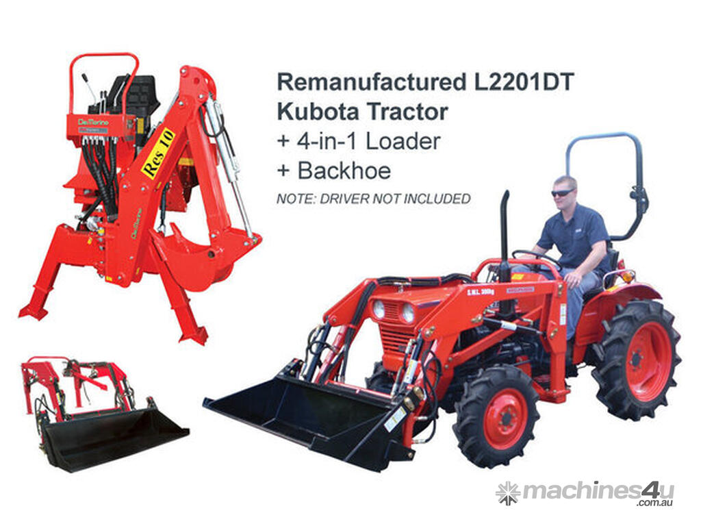 This listing is for a remanufactured Kubota L2201DT tractor, featuring a 4-in-1 front end loader and Del Morino RES10 backhoe.