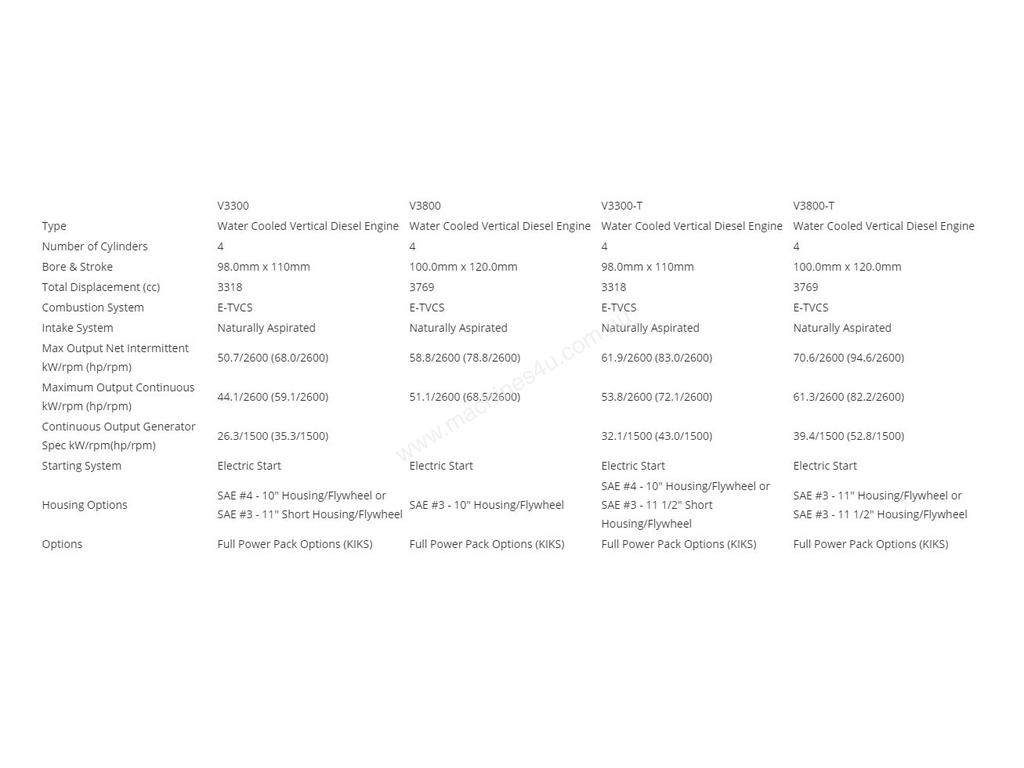 The Kubota V3300-T is a vertical, water-cooled, 4-cycle diesel engine with a capacity of 72.1HP at 2600RPM.