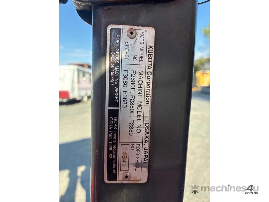 No C/P,Kubota,F3680,Ride On Mower (Out Front),4 Cyl,Diesel,Odometer not visible,2099 (Hrs. Showing on Hour meter),Colour: Red,Rego. No: NP(FW823), Unregistered NSW,Serial No: 17554,ROPS No: 24842,Sold with No Plates,Key No: 3