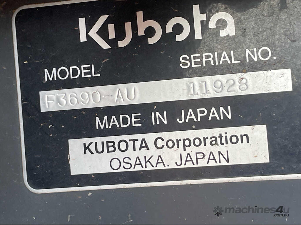 No C/P,Kubota,F3690-AU,Ride On Mower (Out Front),Diesel,Odometer not visible,617 (Hrs. Showing on Hour meter),Unregistered,Serial No: 11928,ROPS No: TekROPS-0810,Sold with No Plates