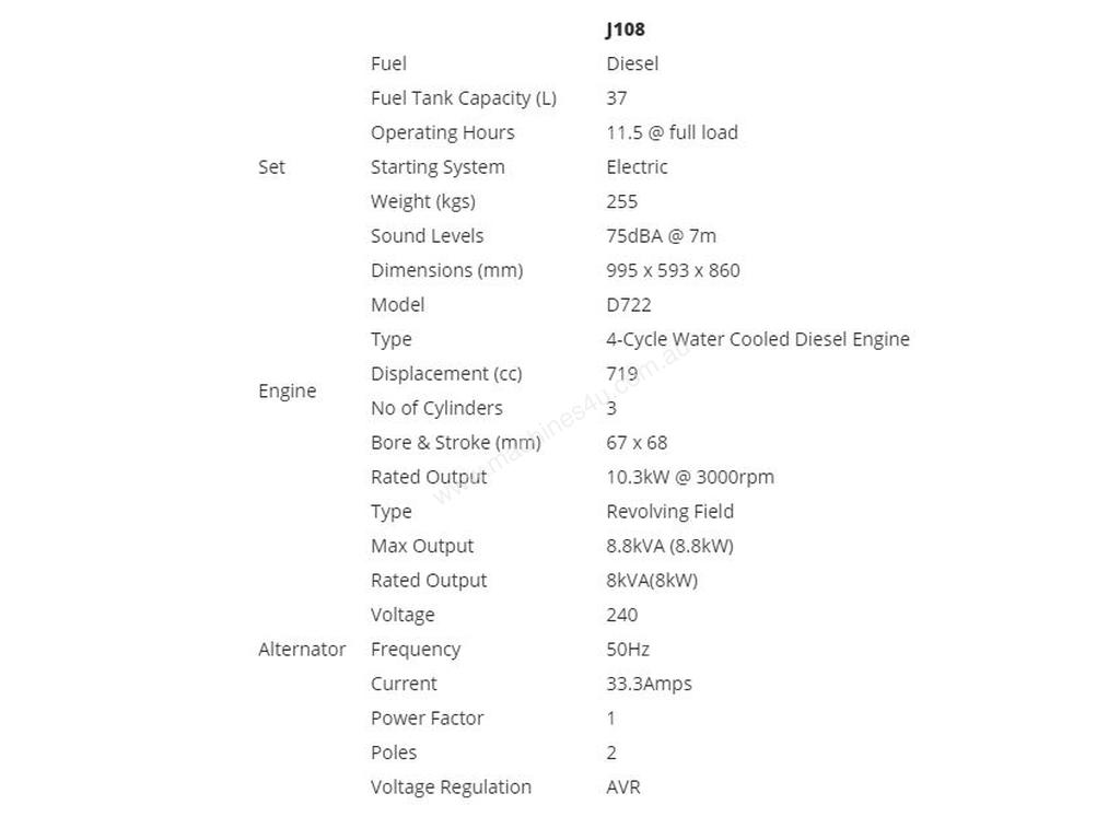 The Kubota J108 is a two pole, partially enclosed, single phase diesel engine with a capacity of 8kVA at 3000RPM.