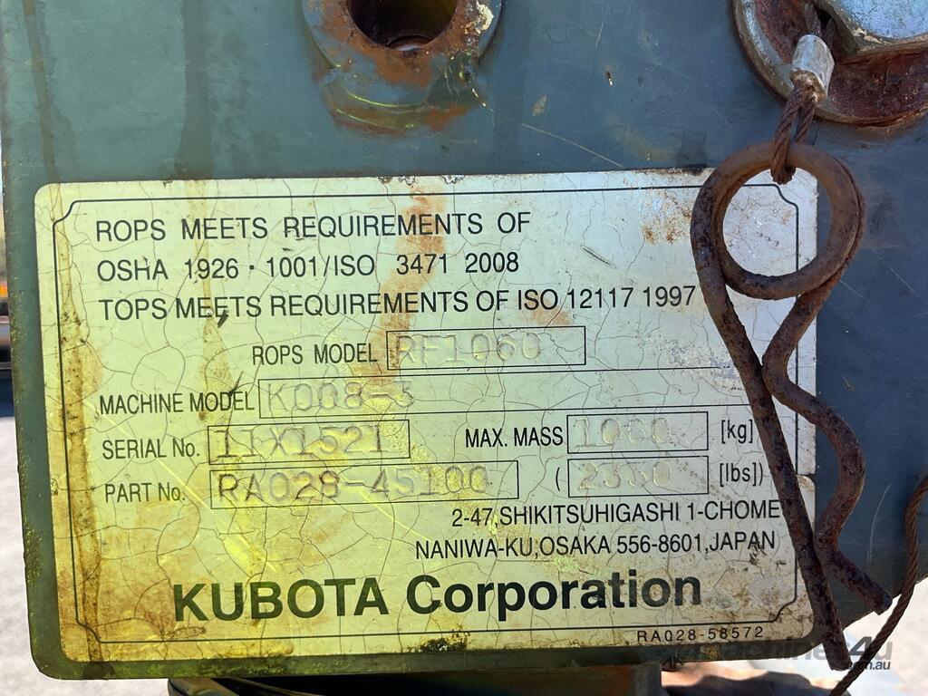 No C/P,Kubota,K008-3,Excavator (Rubber Tracked),Engine #: BS3955,3 Cyl,Diesel,Odometer not visible,972 (Hrs. Showing on Hour meter),Colour: Orange,Unregistered,VIN: JKUU0081H01H22597,Serial No: 22597,ROPS No: 11X1521,Sold with No Plates,Key No: 37E