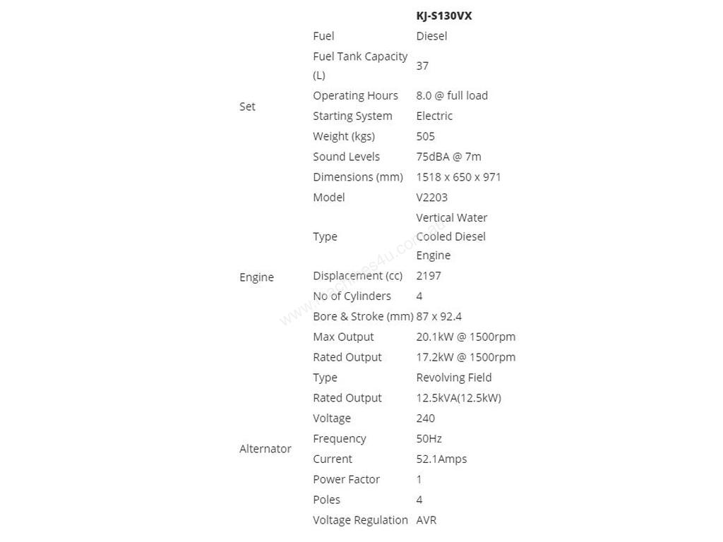 The Kubota KJ-S130VX is a four pole, fully cabinet style, single phase diesel generator, with a capacity of 12.5kVA and 1500RPM.